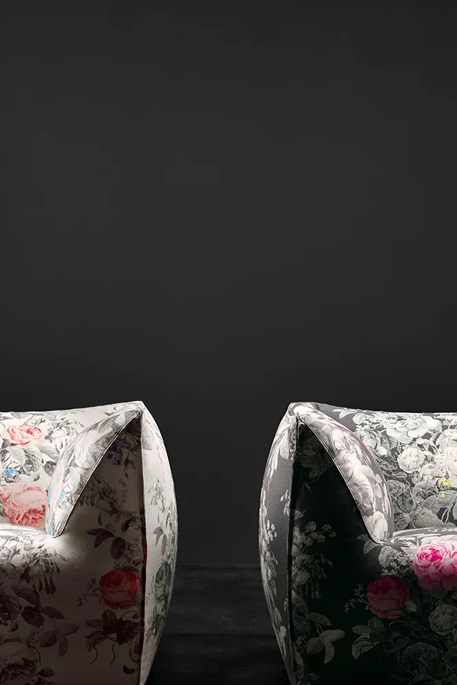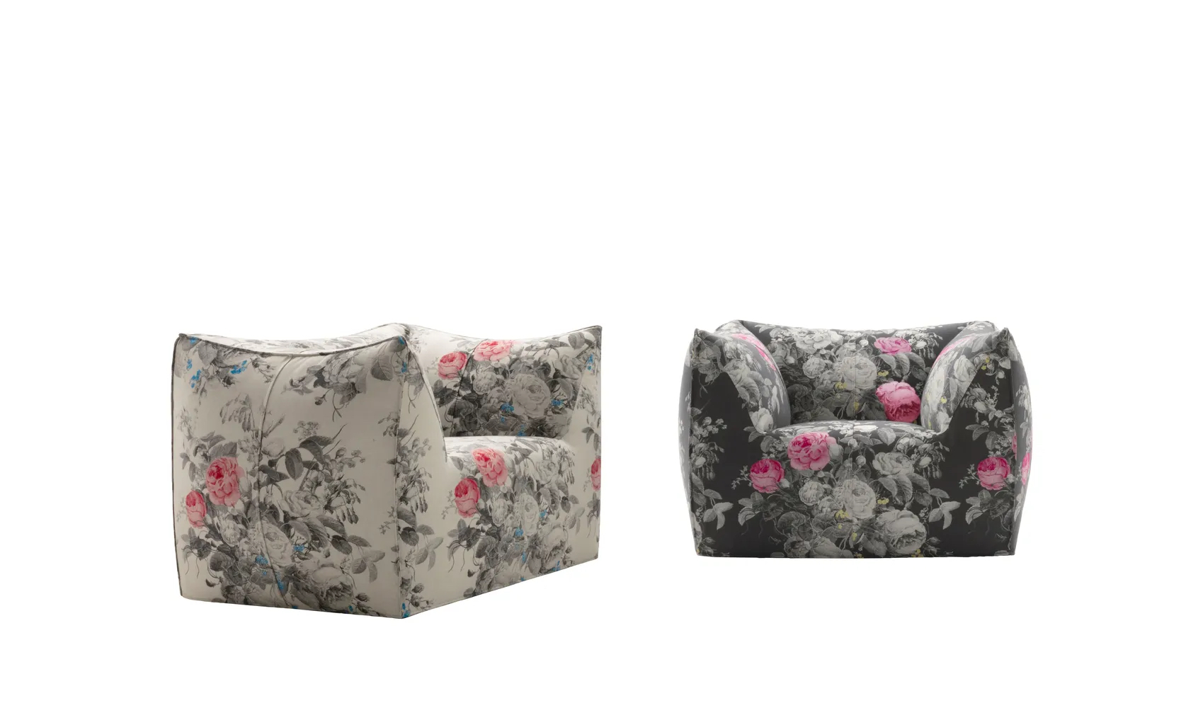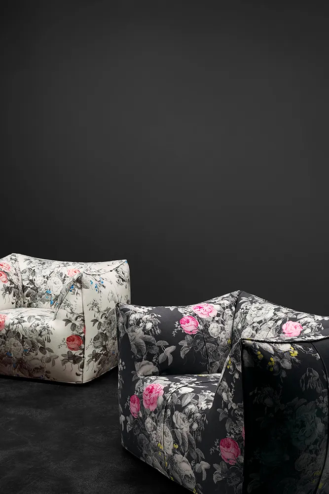 The renewal of this collection brings with it new coverings. A new sablé fabric (Sila) available in eight colours. Its pleasingly irregular, three-dimensional nature masks the orthogonal effect of warp and weft, amplifying the effect of softness through a studied irregularity that seems reminiscent of natural, spontaneous surfaces. This sensation begins with sight and is completed by touch. In fact, as Mario Bellini says: ‘The variation of this fabric, when in contact with your hands, your arms, your body, empathises with your skin and is extremely pleasant’.Another exciting new addition is a dreamy and humorous floral print fabric (Manila) characterised by large roses with a classic feel, an unusual contrast capable of giving each Bambola a totally unexpected outfit. This limited edition fabric is available on a white or black base. Le Bambole can also be upholstered in high-quality leather (Kasia) , an extremely soft and naturally marked full-grain leather. Here, too, touch and sight are equally satisfied, giving each Bambola an even more elegant and refined appearance.