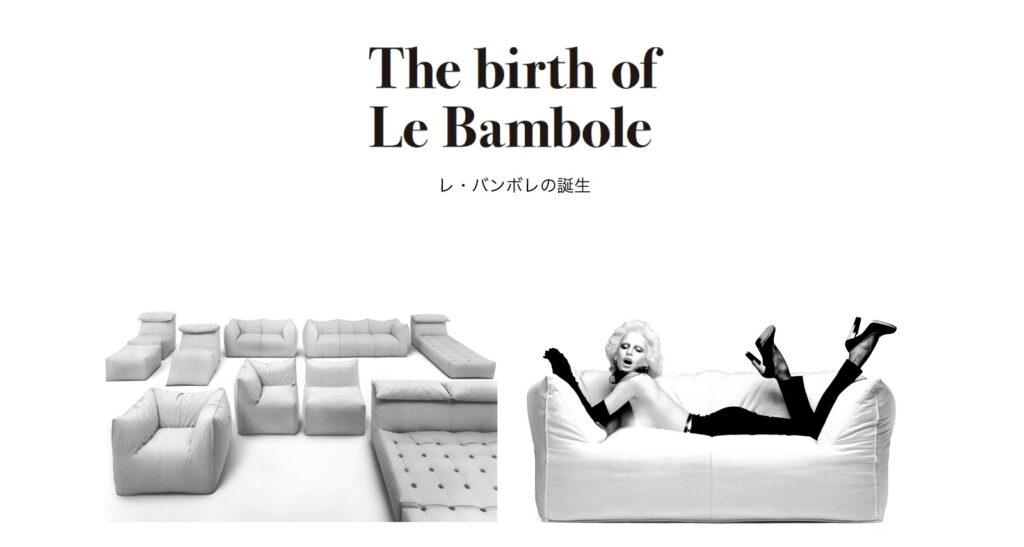 イタリア語で【お人形】を意味する<Le Bambole>のアイデアは「床に置いた大きなクッション」より着想を得、その上に座る人によって形状を成していくポップでカジュアルな新しい快適さをもつソファでした。
