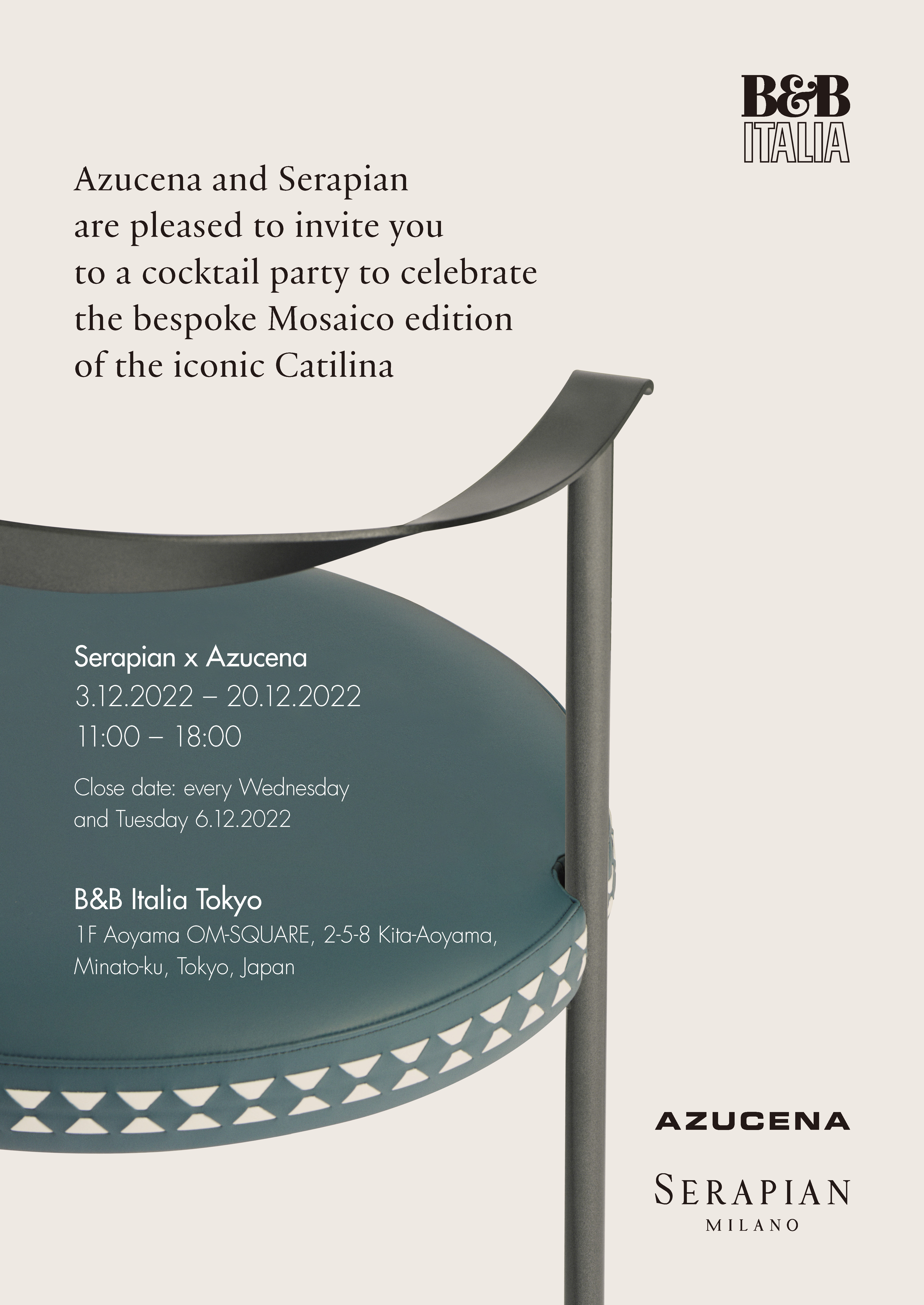 AZUCENA創業年に発表されたSERAPIAN『 Mosaico ( モザイコ ) 』の技巧をシートクッションに施す特別な《 Catilina 》は、24色から多彩な色の組み合わせが楽しめるカスタムメイドにより、デザインの完成度をより高めています。
