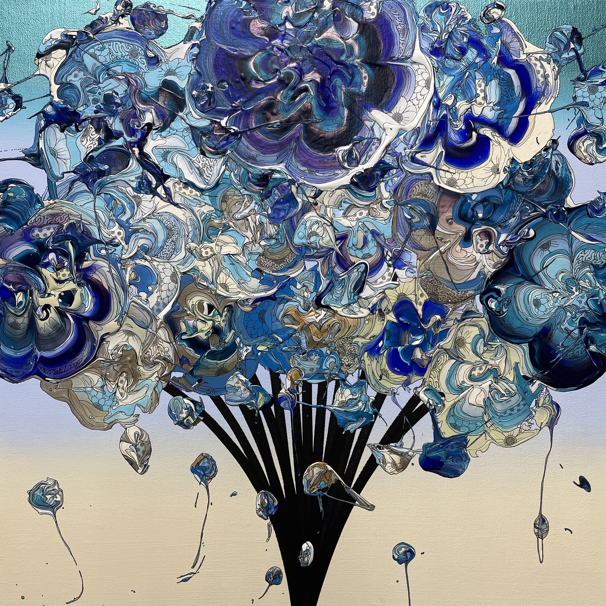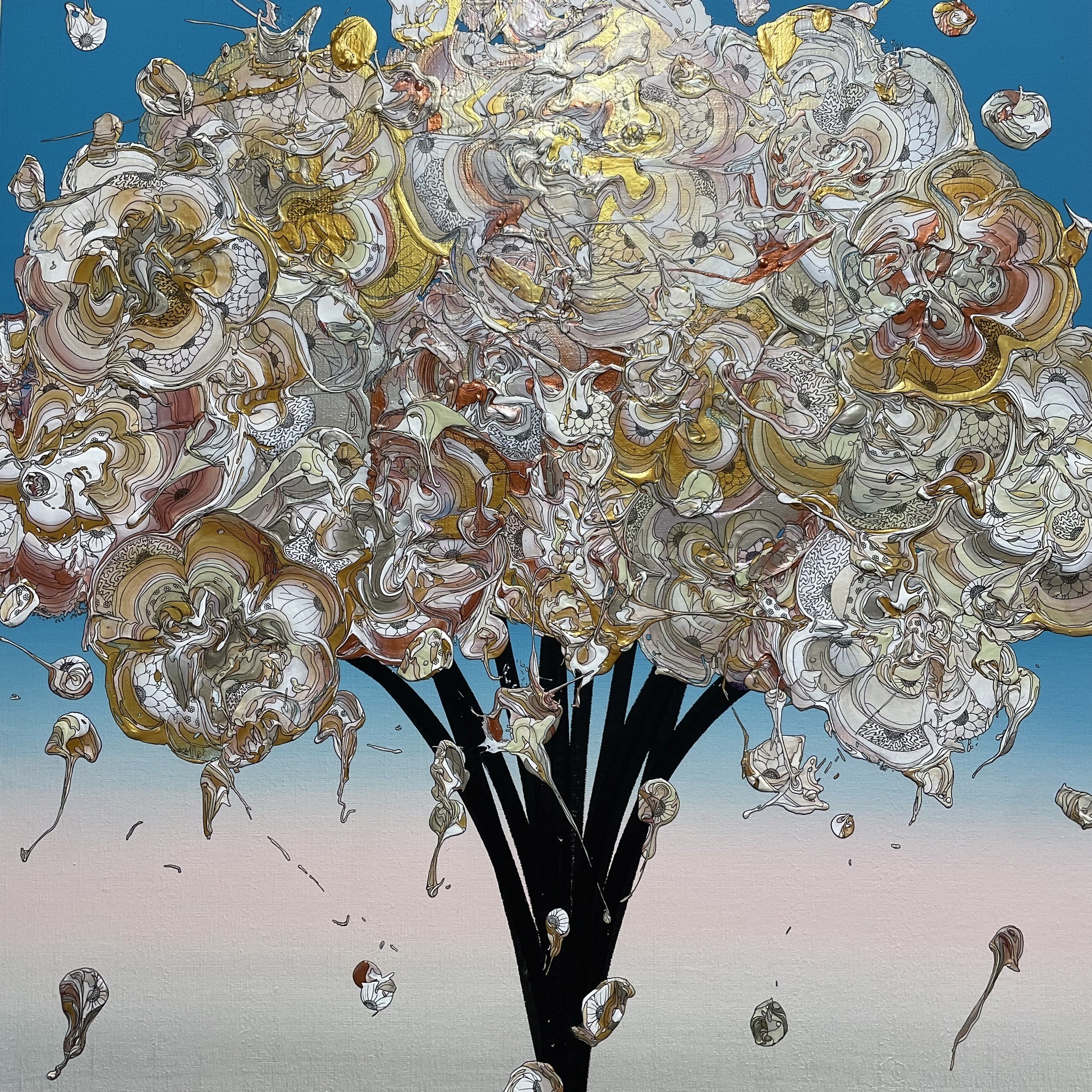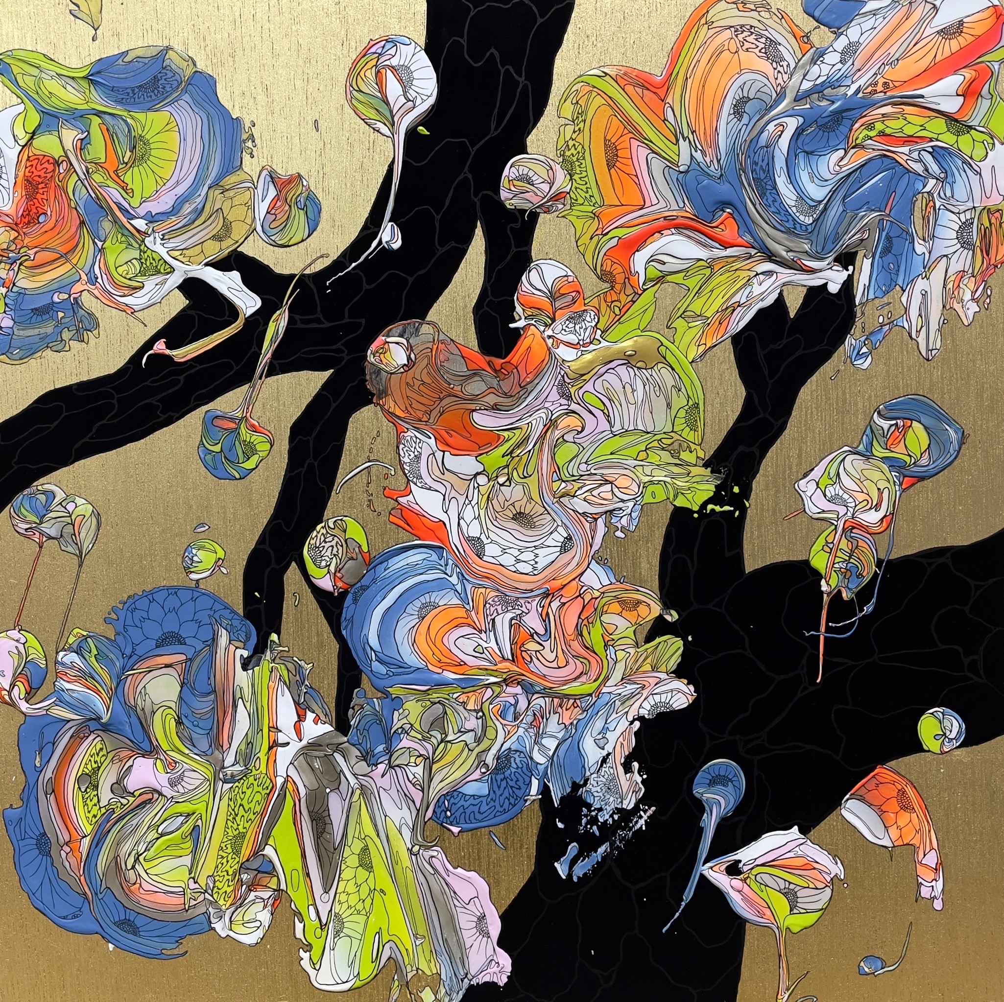 混ざり合う絵の具から生まれる偶発性に、極細のペンにより緻密な線で描かれる必然性を織り交ぜることで、「偶発」を「必然」へと自らの意思によって切り開いていくことを表現しています。