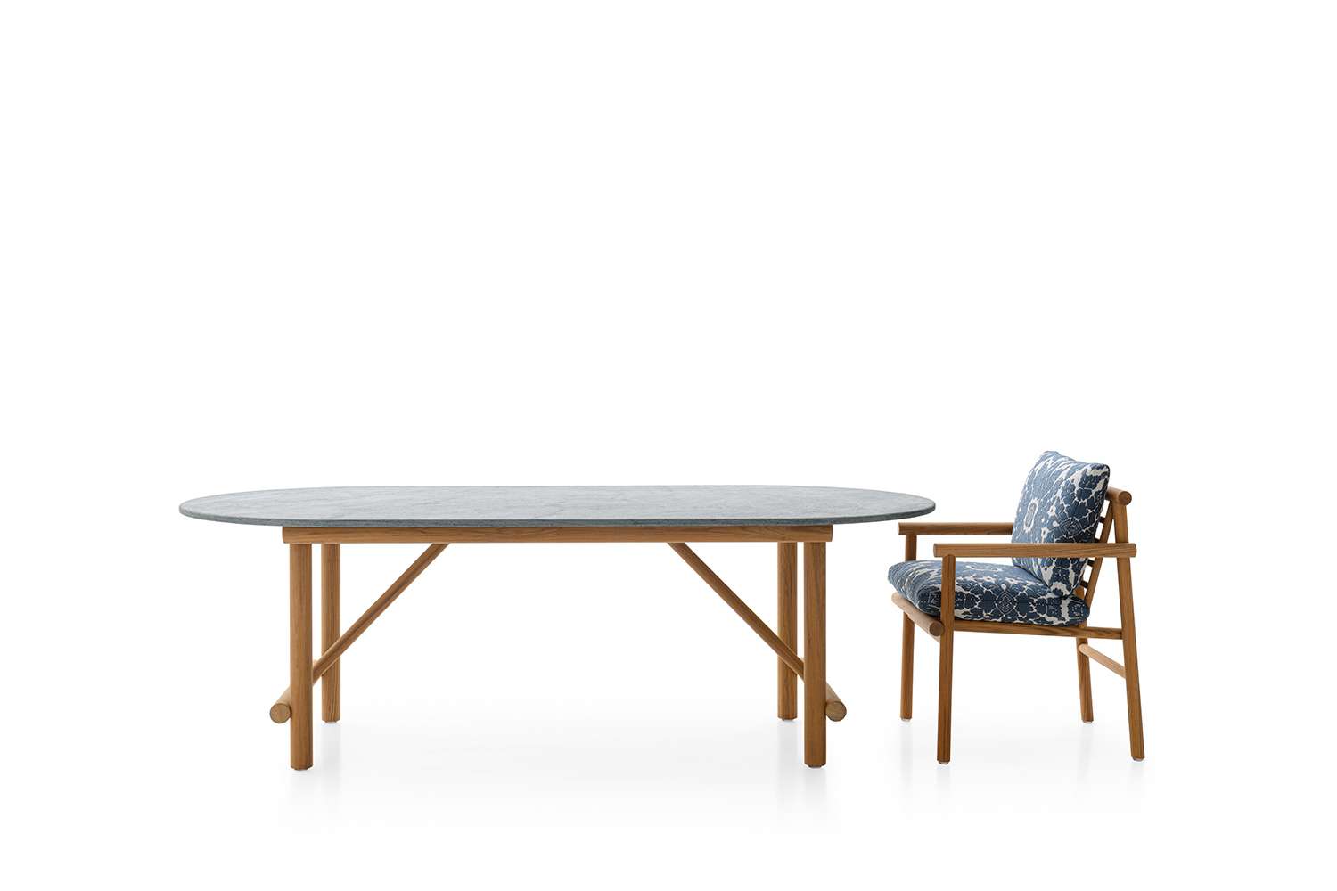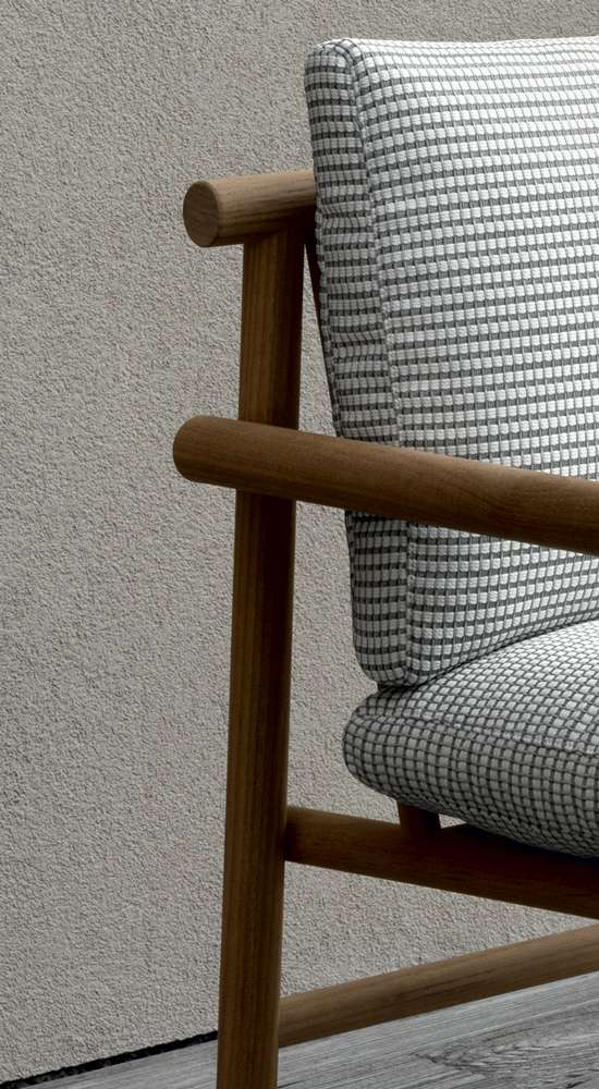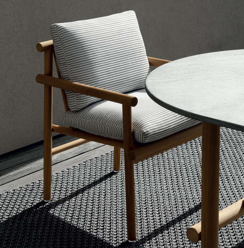 ダイニングチェアは同コレクションの他の製品と同じで、完全な統一感を感じさせるスタイリッシュな特徴を持っています。フレーム構造は天然チーク材、背面・座面の2つのクッションはふくよかで張りのあるファブリック仕様となっています。
