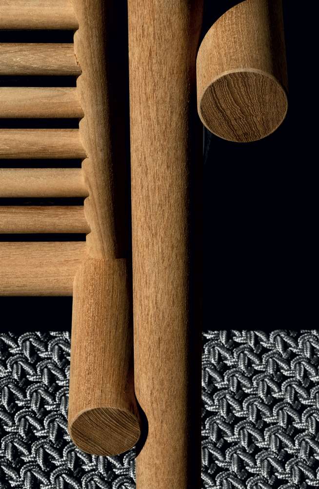 奥行と高さが東南アジアの伝統を模しているとするなら、バックレストはスウェーデンのウォールバー(壁に取り付けた体操用の肋木)を思い起こさせ、エクササイズ器具が耐荷重エレメントになっていると言えます。このような仕組みがアヤナを楽しく、360度どこから見えても見栄えのいいものに仕上げています。個々の素材が織りなす交差と配分が新しくエレガントな相互作用を見せます。