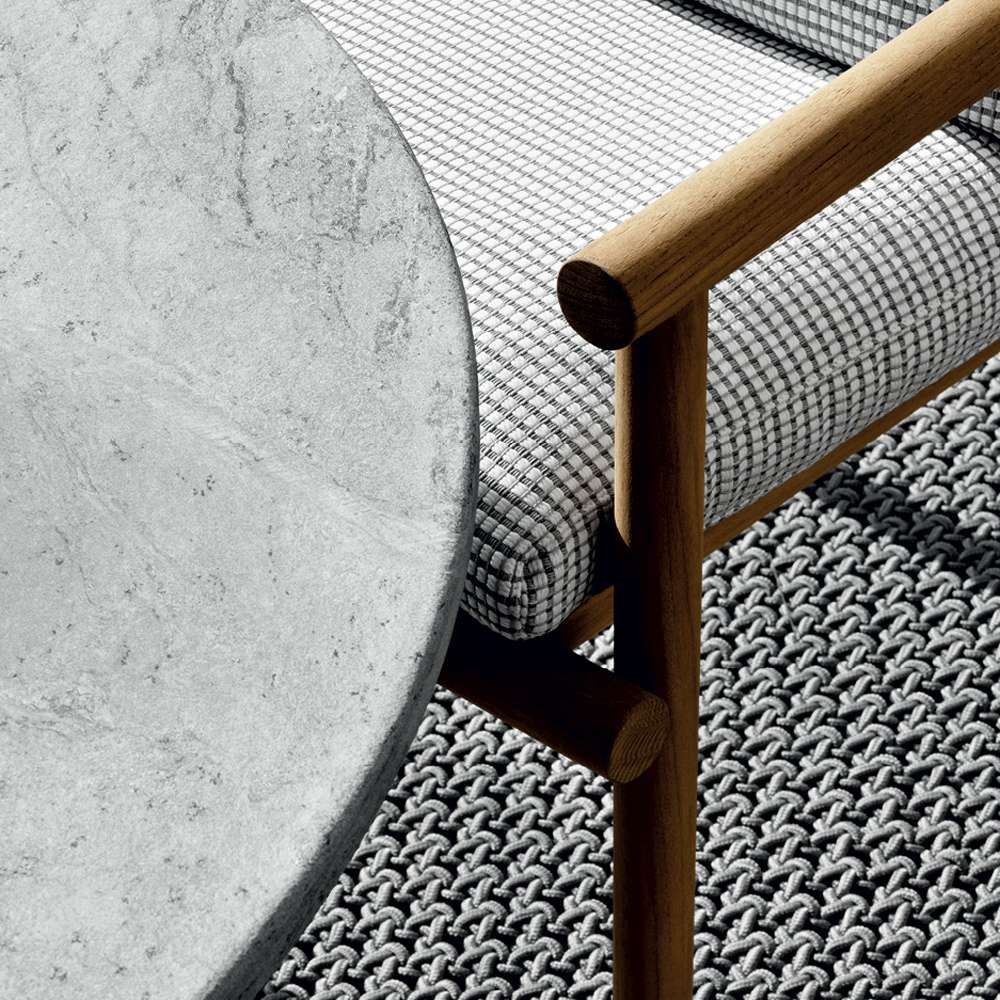 ダイニングテーブルのフレーム構造は天然チーク材、アルプス地方の典型的な自然石サーペンタインを使用した楕円形のトップが目を引きます。支え構造は一見軽く見えますが、非常にがっしりとしており、悪天候にも耐え、重いトップを難なく支えます。コーヒーテーブルもまた天然チークの丸太構造、サーペンタインのトップです。アヤナソファ、チェアを含め品揃えが豊富なので、アウトドアのセッティングに楽しさをもたらします。