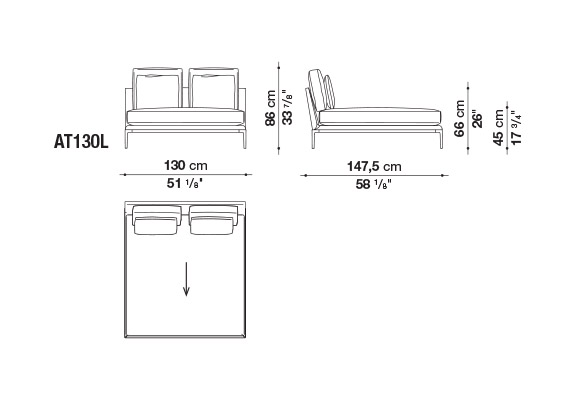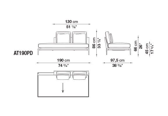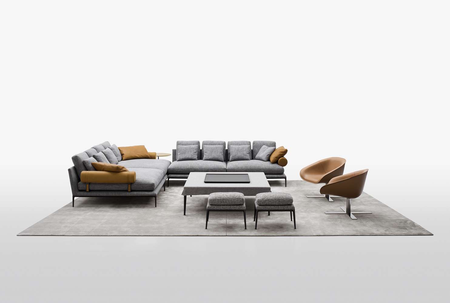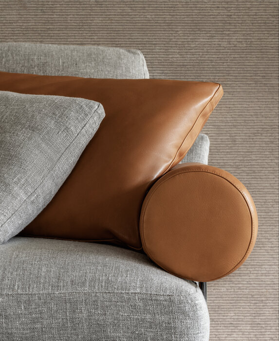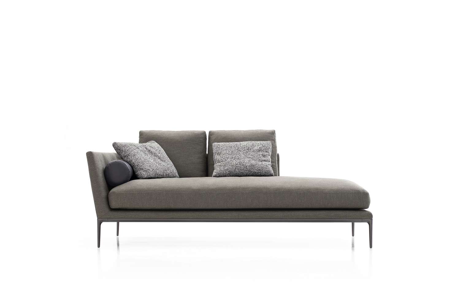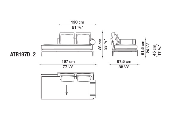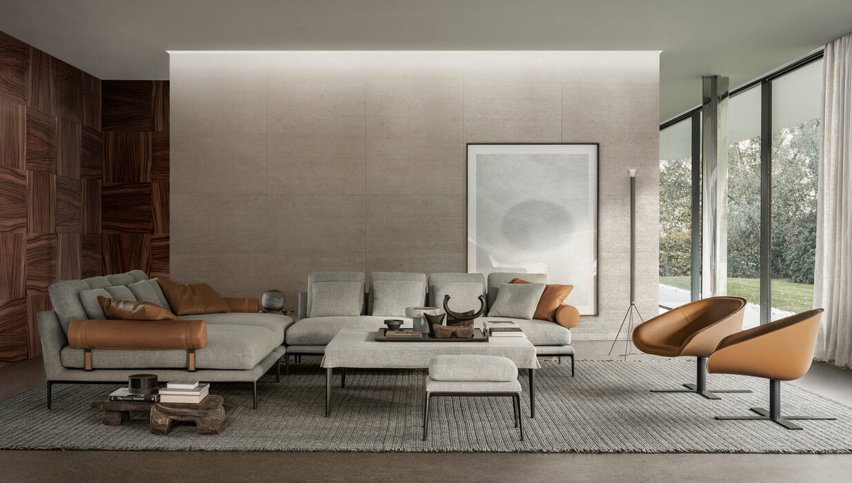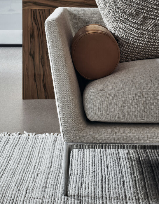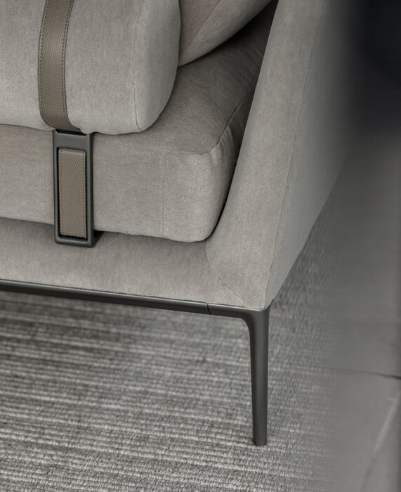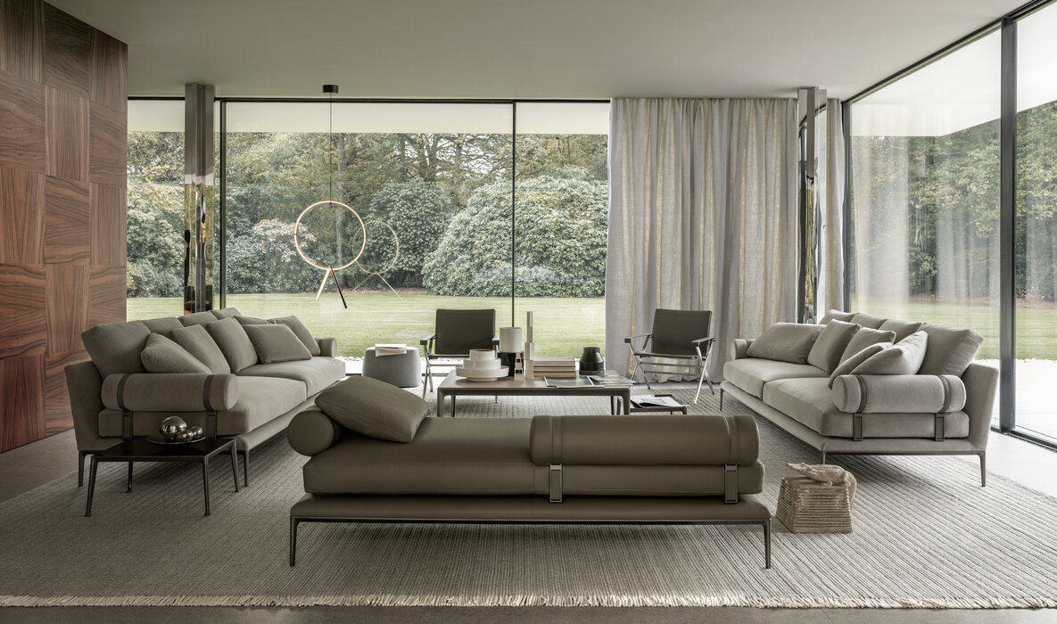 珊瑚礁から名前をつけられたB&B アトゥールは、アントニオ・チッテリオによるモデュラーシーティングの新しいシステムで、洗練された芸術的な形が最終的に現代的なスタイルで、しかも極めてエレガントにバランスよく表現されています。システムは、アームレストとバックレストを伴う190cm と240cmの幅にそれぞれ90cmの奥行、そして130cmの幅に140cmの奥行という3つの基本的なプラットフォームから構成されており、ソファとデイベッド、コーナーエンドモデュール、あるいは、シングル、シェーズロングやオットマンなど様々なバリエーションのシーティングスタイルが形成されます。床からやや高い位置にあるベースフレームは、スレンダーなラインの軽やかなダイキャストメタルで作られた構造で座面のマットとの境界をより強調しています。フレームのダイキャストメタルは、ピューターとブラッククロームの2種類の仕上から選択できます。サポートエレメントとしてより特徴的なのは、ダイキャストの構造フレームにレザーストラップ巻かれた円筒形のボルスターで、2種類(65cmと90cm)の奥行があります。このアクセサリーは、シートクッションとベースフレームの間、もしくはシートクッションの継ぎ目の間にセットして、アームレストや背もたれのように望んだ機能の使い方をすることができます。B&B アトゥールは、様々な組み合わせを創り出すことができるダイナミックなプロジェクトで、インフォーマルなリラックスした状況から最もフォーマルなバージョンまでのシーティングタイプをバッククッションなどのコンプリメントを使うことにより可能にします。