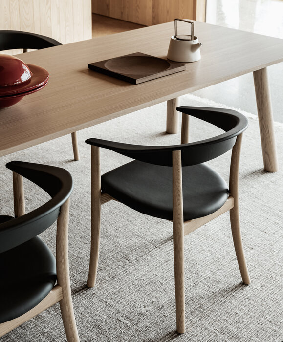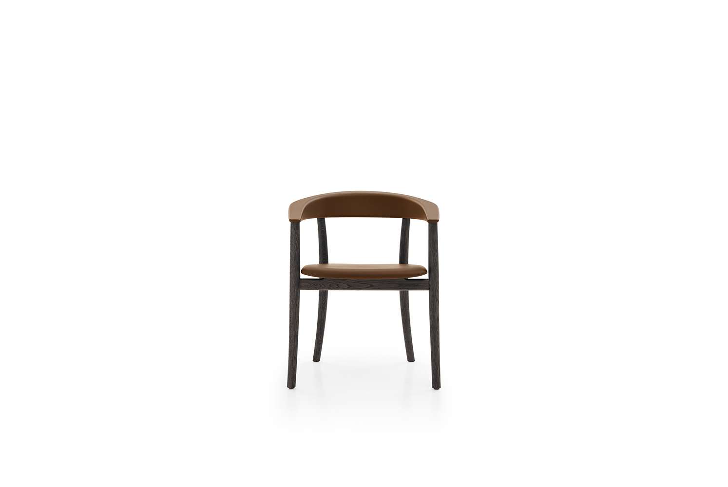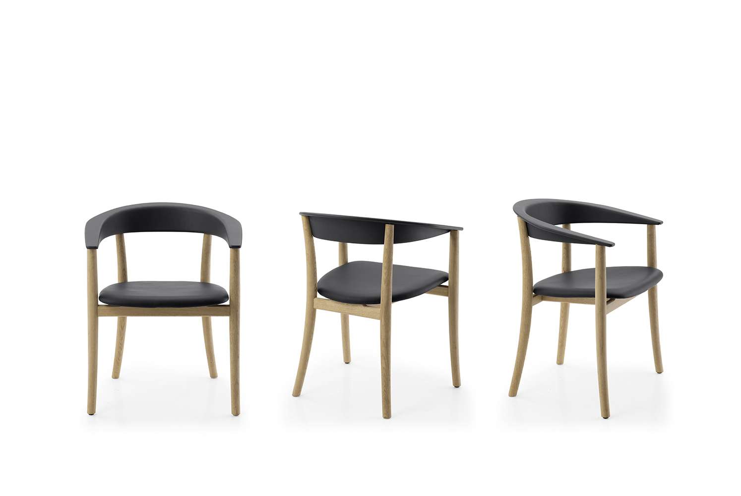 文学の知的な役割と様式美を併せ持ったBelle<ベッレ>チェアは、同じく深澤がデザインした男性的なブルテーブルと対をなす繊細で女性的な椅子です。丸みを帯びたラインと革張りのパッドが施された座面は、丸い断面のテーブル脚を再解釈して、湾曲した優雅な感触を創り出しています。その脚は、チェアバックにつながり肘のようなエレガントな形のアー ムになっていきます。