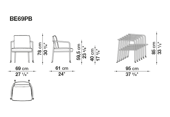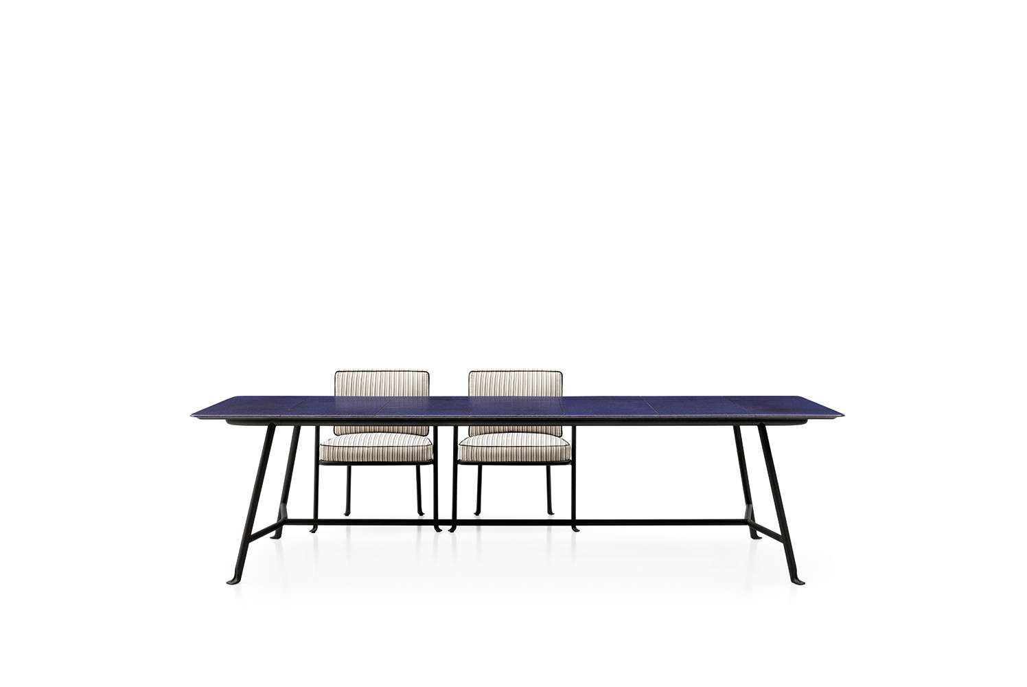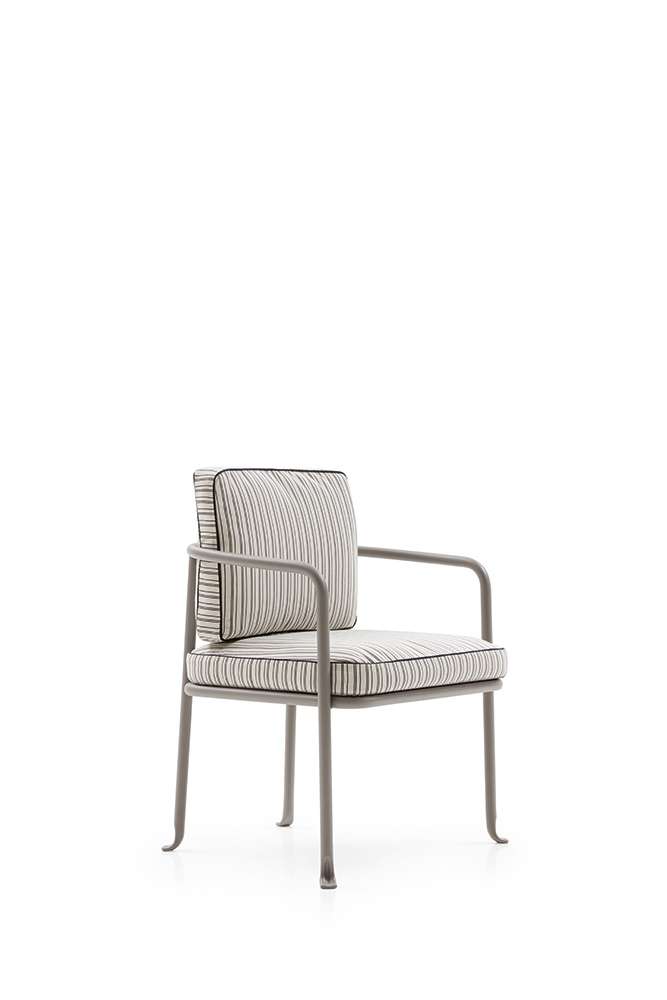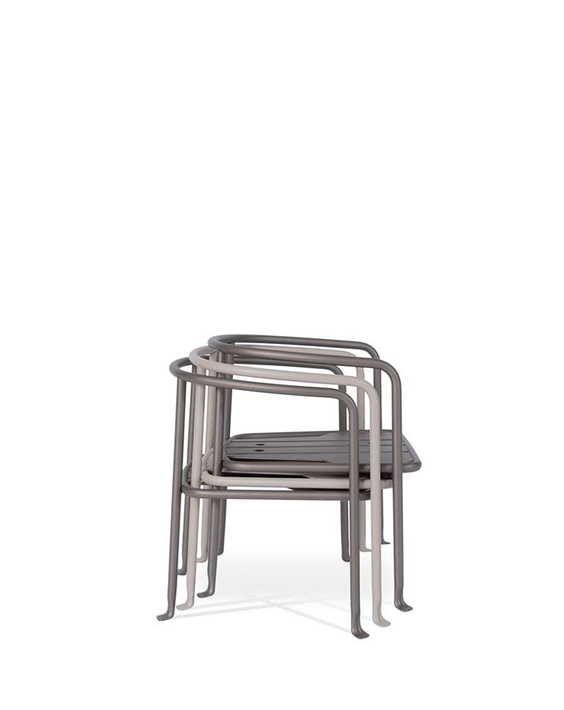 金属の曲げ加工は、航空業界でよく使われている技術を屋外用家具の世界に持ち込み、紛れもないスタイルのコレクションに命を吹き込んでいます。このコレクションには、2人掛けと3人掛けのソファ、オーバーサイズのアームチェア、低めのスモールアームチェア、ダイニングチェアがあり、いずれもスタッキング可能なアルミニウム構造に塗装が施されています。柔らかでリラックスできるだけでなく、持続可能性を考慮して開発された、たっぷりとしたクッションが快適さを約束します。