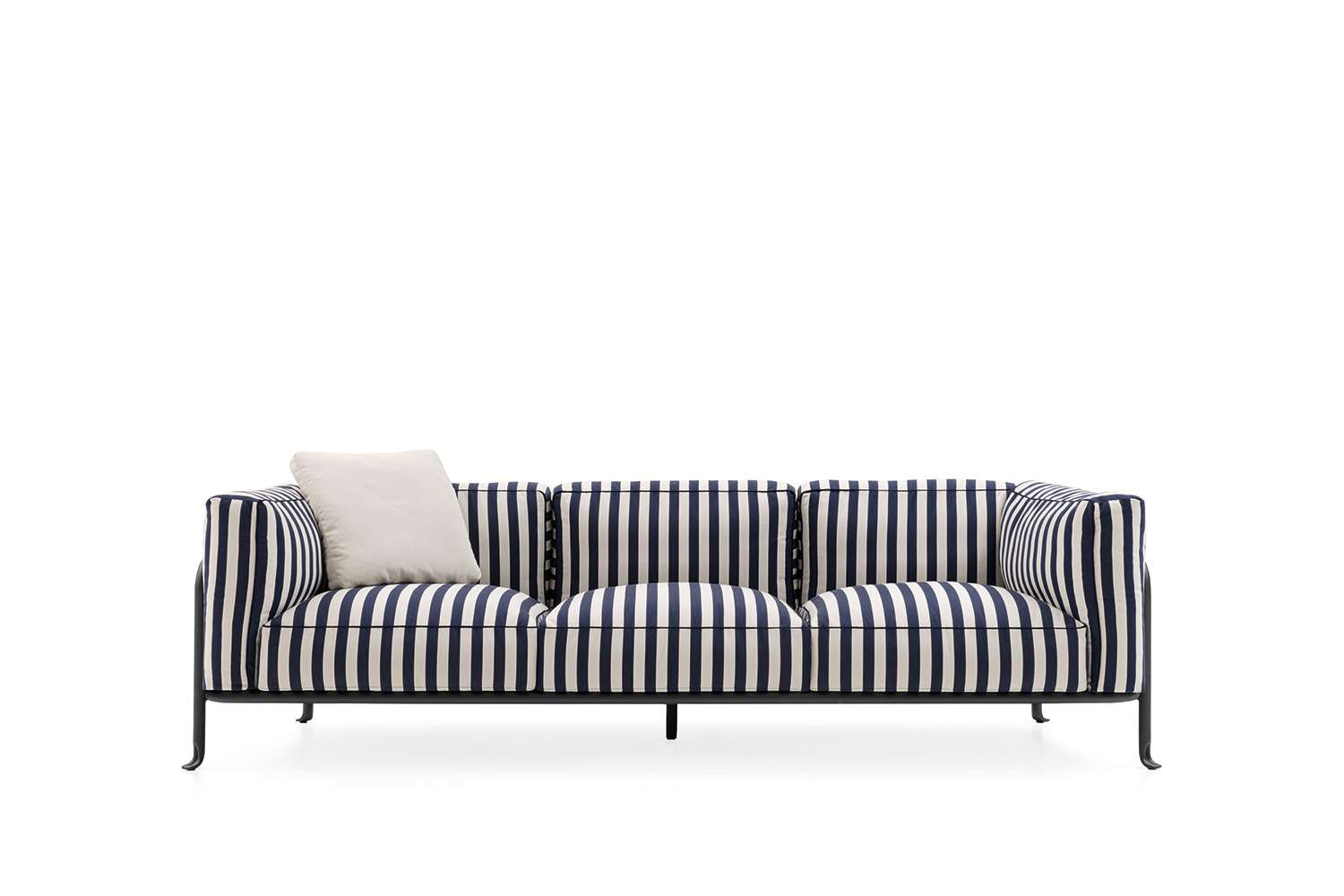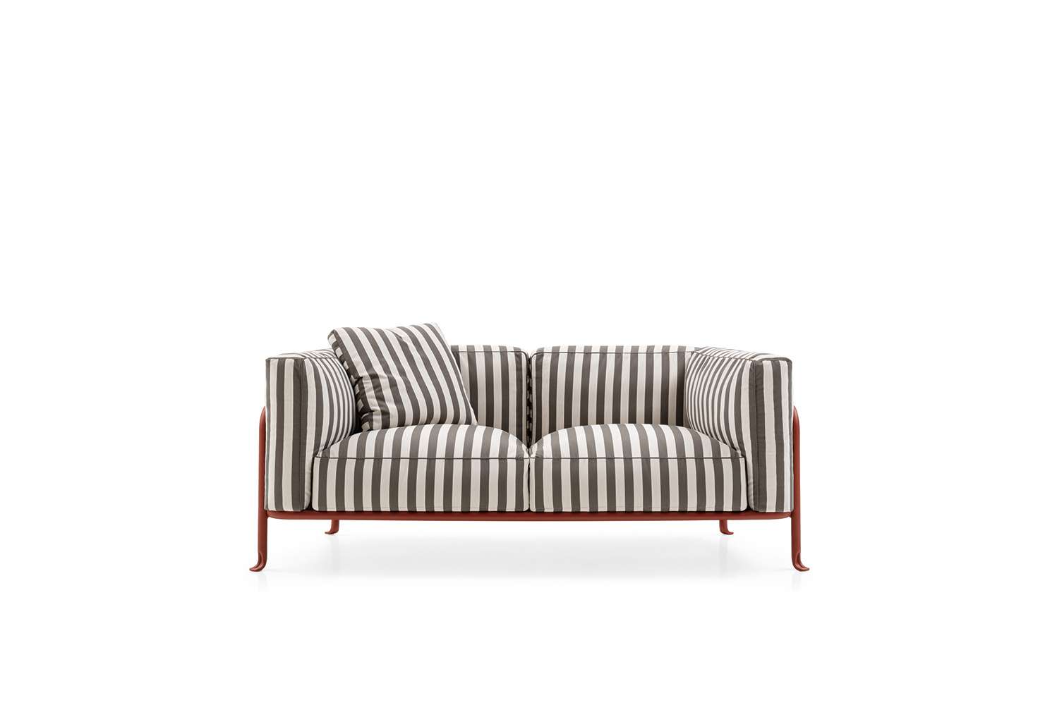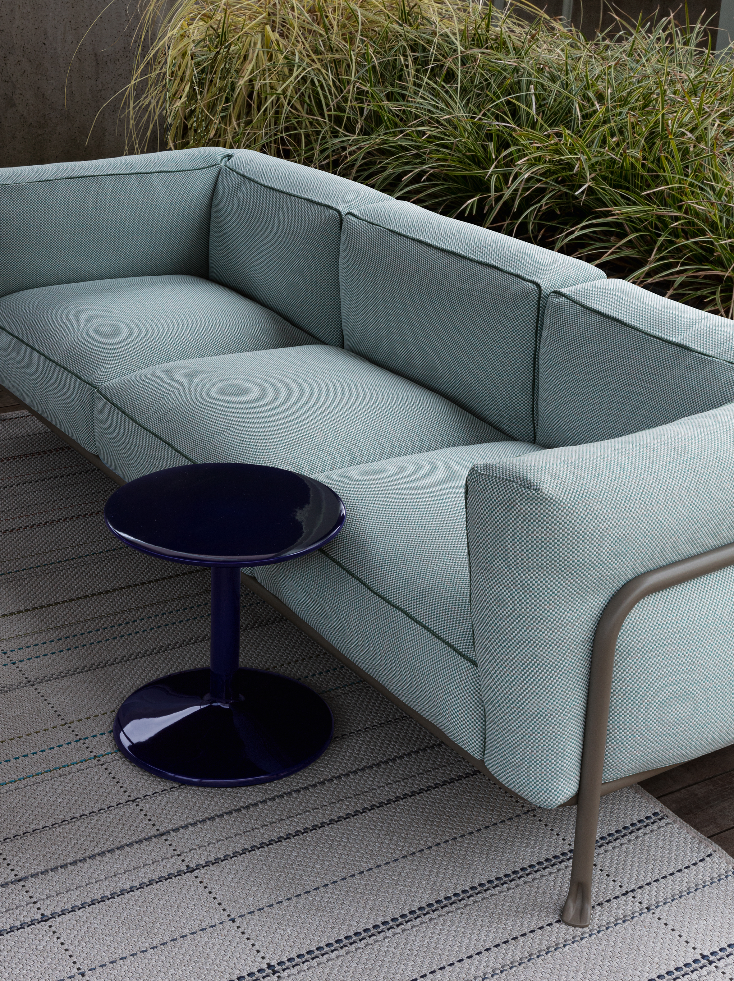 金属の曲げ加工は、航空業界でよく使われている技術を屋外用家具の世界に持ち込み、紛れもないスタイルのコレクションに命を吹き込んでいます。このコレクションには、2人掛けと3人掛けのソファ、オーバーサイズのアームチェア、低めのスモールアームチェア、ダイニングチェアがあり、いずれもスタッキング可能なアルミニウム構造に塗装が施されています。柔らかでリラックスできるだけでなく、持続可能性を考慮して開発された、たっぷりとしたクッションが快適さを約束します。