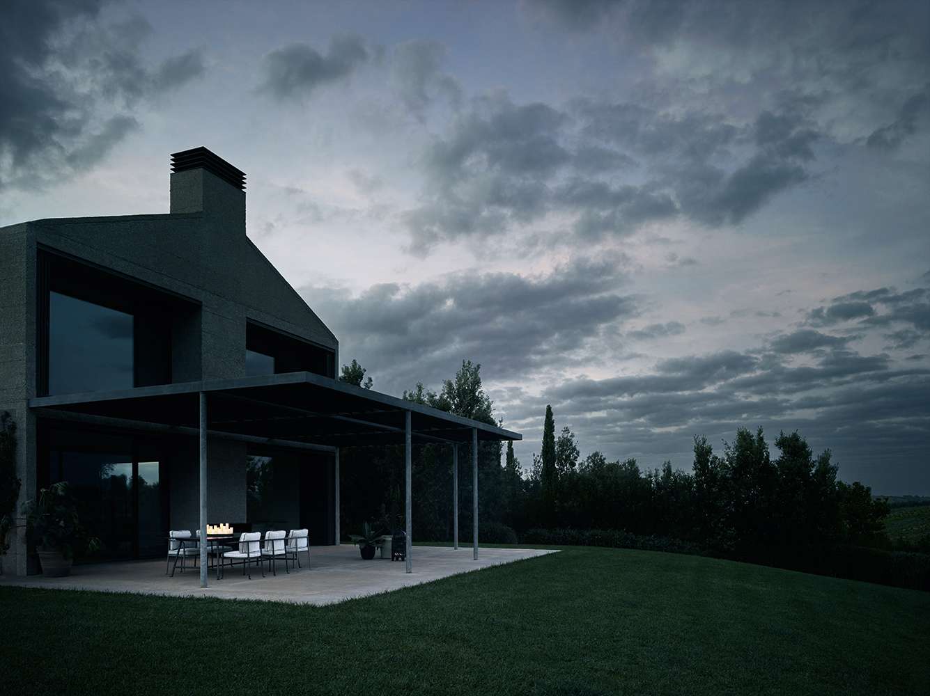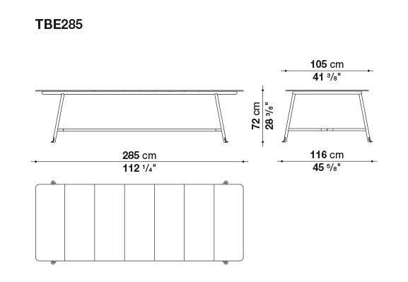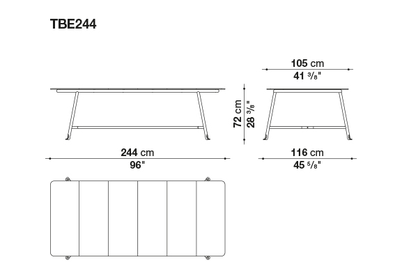 ダイニングテーブルは、シーティングストラクチャーのデザインと色合いを踏襲していますが、アルミニウムの代わりにスチールを使用し、釉薬をかけた溶岩石の特徴的な天板を支えています。溶岩石はエトナ山(イタリア・シチリア島)の斜面で産出されたもので、大きな長方形のタイルはコレクション全体に調和する明るい3色が用意されています。釉薬のかかった表面は、廃棄されたテレビやPCモニターのガラスを再利用して作られた特殊な素材で、独自の製造工程で石に直接塗布されています。テーブルは、6人掛けと8人掛けの2種類のサイズがあります。