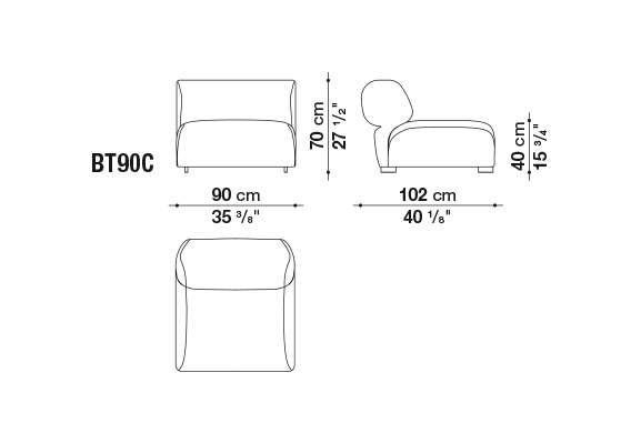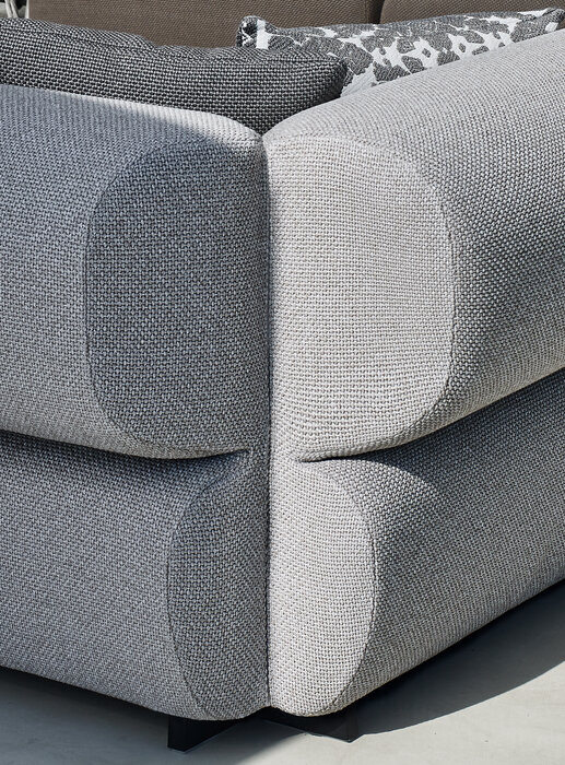 Butterfly、その名は、アームレスト、バックレストの外側のフォルムがまるで蝶の様に見えることに由来しています。効率よく組み替えることのできるモデュール式のユニットにより自由でゆったりとした使い方で快適なひとときを演出します。内部構造は、オットマンの形を基本として、左右のアームレスト、背もたれの部材をシンプルな部品で接続することにより、左右、中央に何を配置するかによって、変幻自在なスタイルとレイアウトを実現します。これらはファブリック張りの曲線を全面に押し出した初めてのアウトドア・ソファで、室内用ソファのクオリティや快適さをアウトドア仕様にも反映させるため、B&B ITALIAの製造技術を最大限に駆使しました。強度の高い素材、そしてその柔らかな形状は快適さを生み出すとともに、ホテルや海沿いのリゾートなど多岐にわたる実用性を兼ねています。