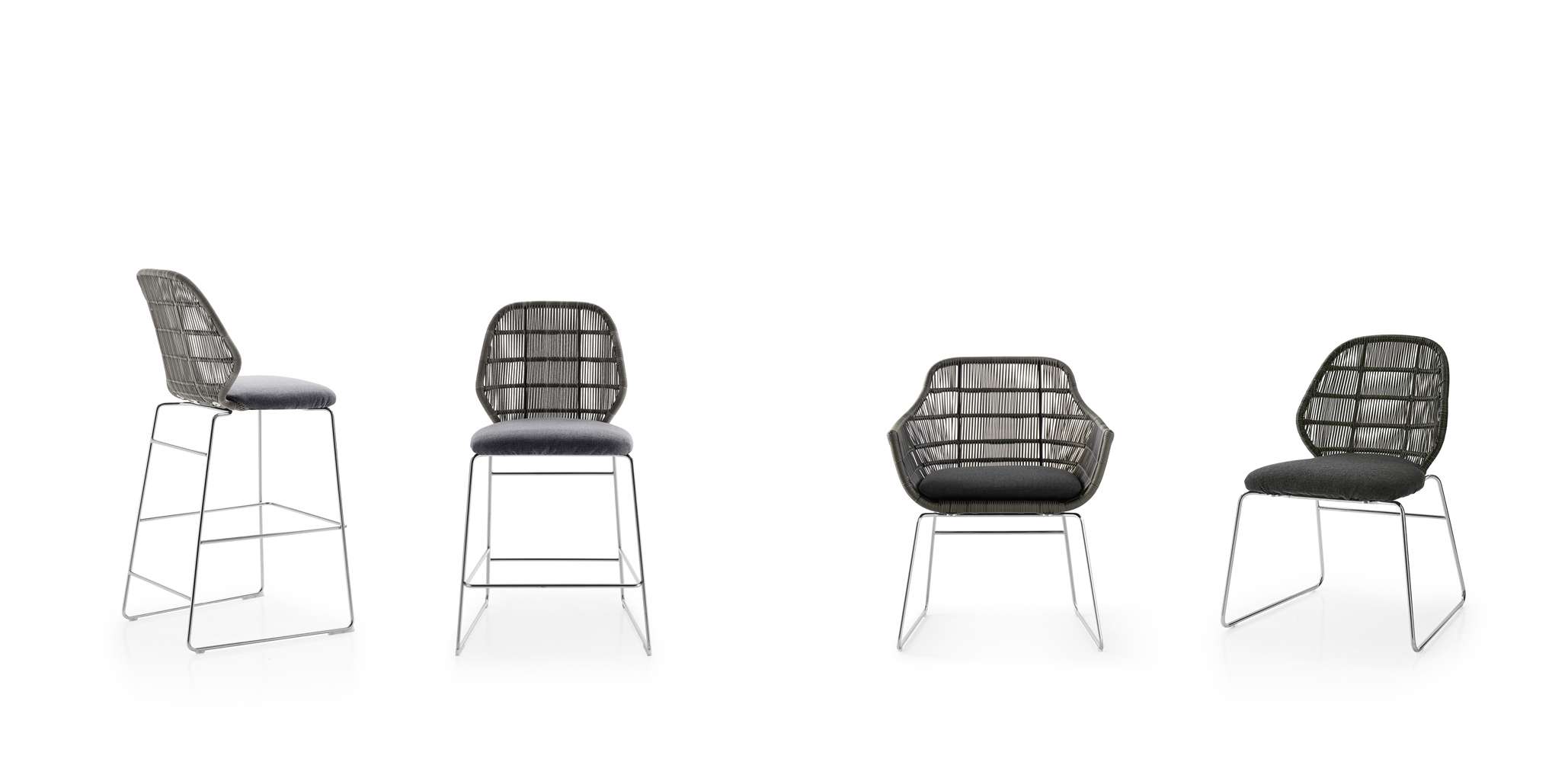チェア、スツール、スモールアームチェア、アームチェアなど形・高さの異なるデザインを展開しています。アウトドアだけでなくインドアにも合うデザインです。
