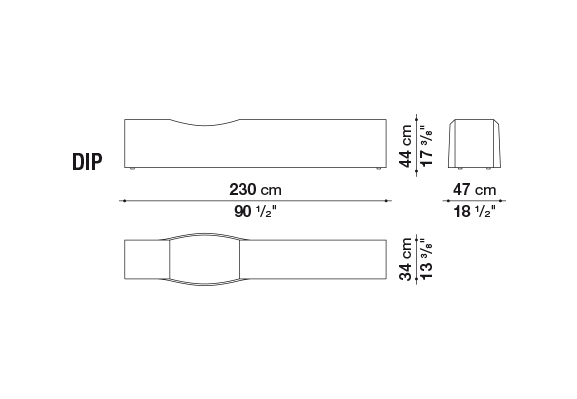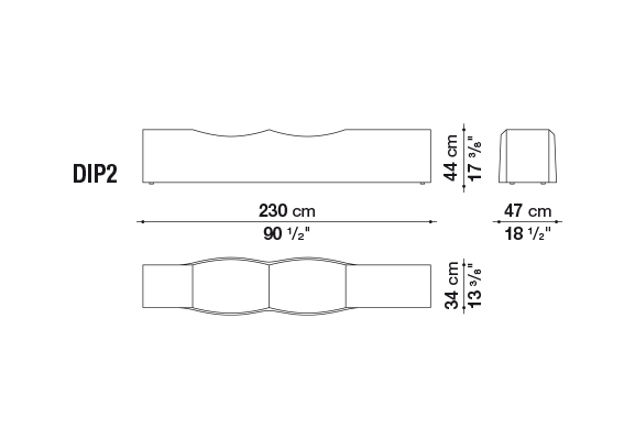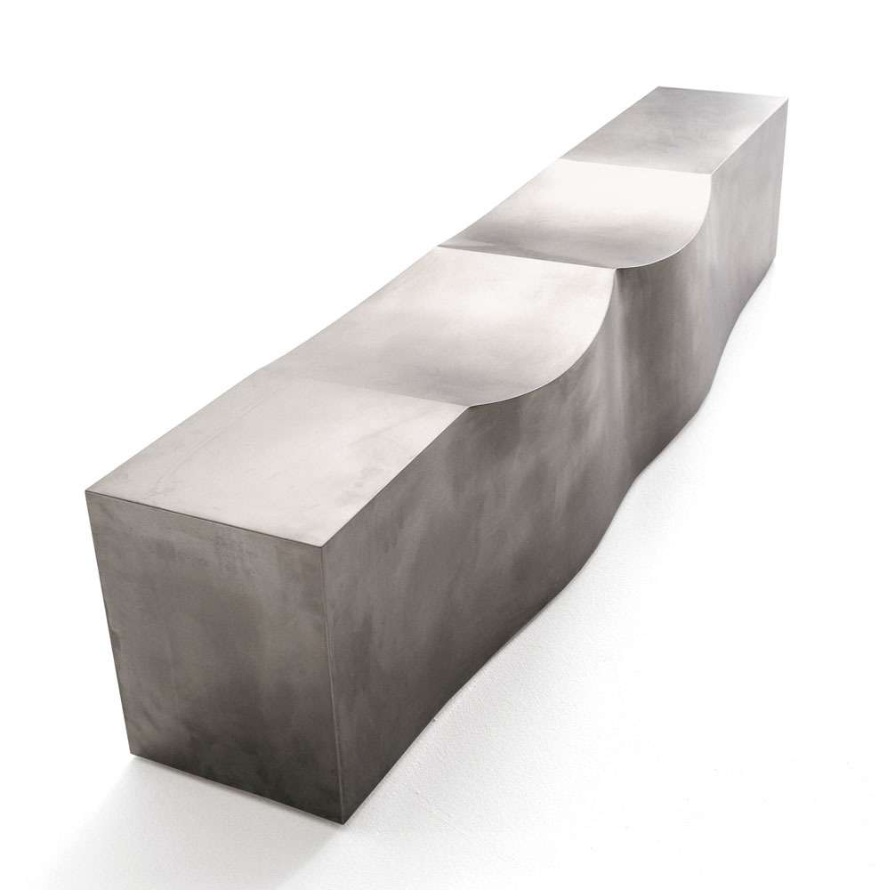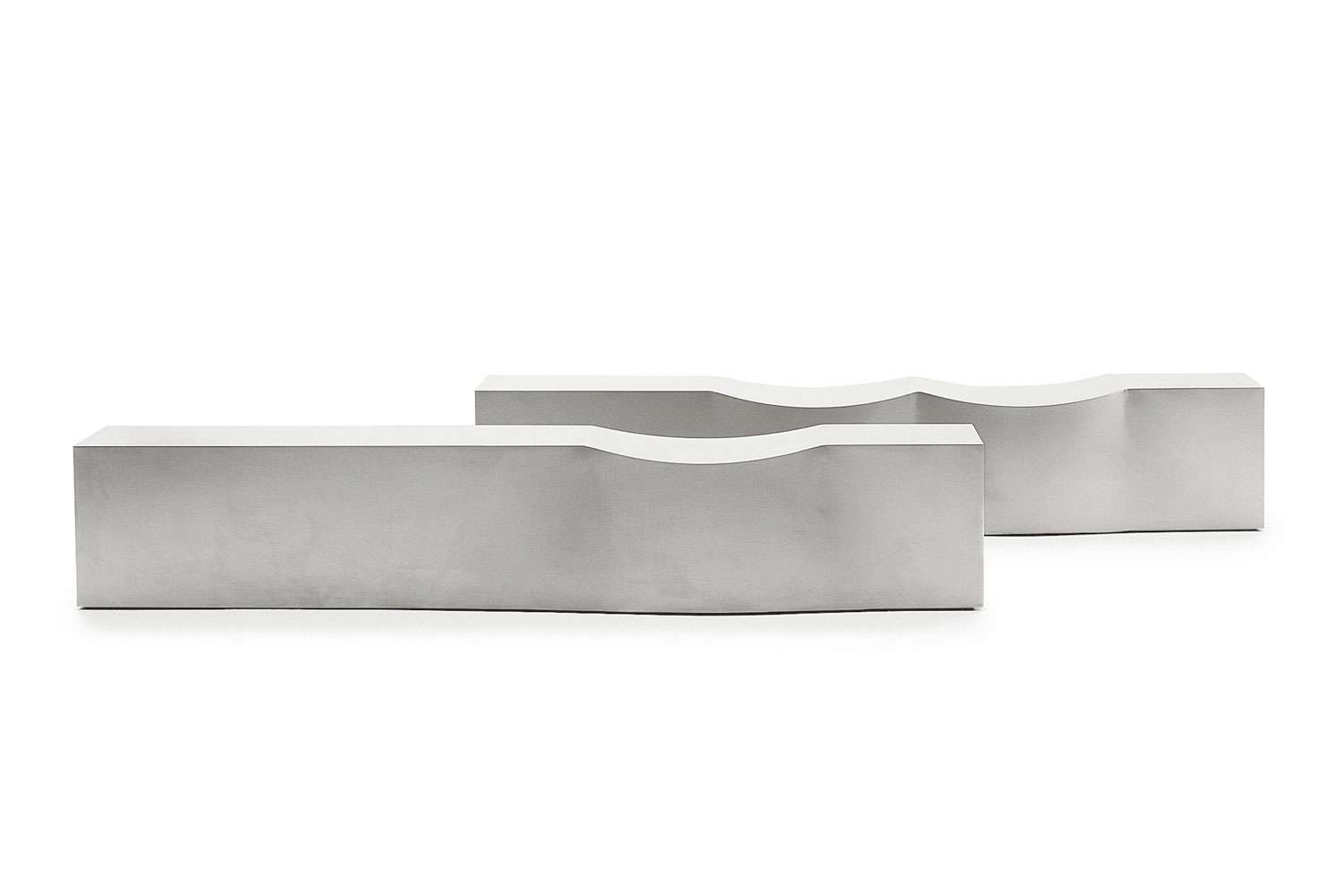 サイズは1種類、形状は2種類あり、厚さ1.5mmのステンレス板に円形のサンドブラスト仕上げを施しています。形状は、フライス加工、曲げ、溶接などの特殊な技術で作られています。凹んで突き出た柔らかな曲線のフォルムと、四角い部分のコントラストが効いた彫刻的なモノリスのように見えます。ベンチは重厚感があり、同時に洗練されたミニマリストのような印象を与えます。