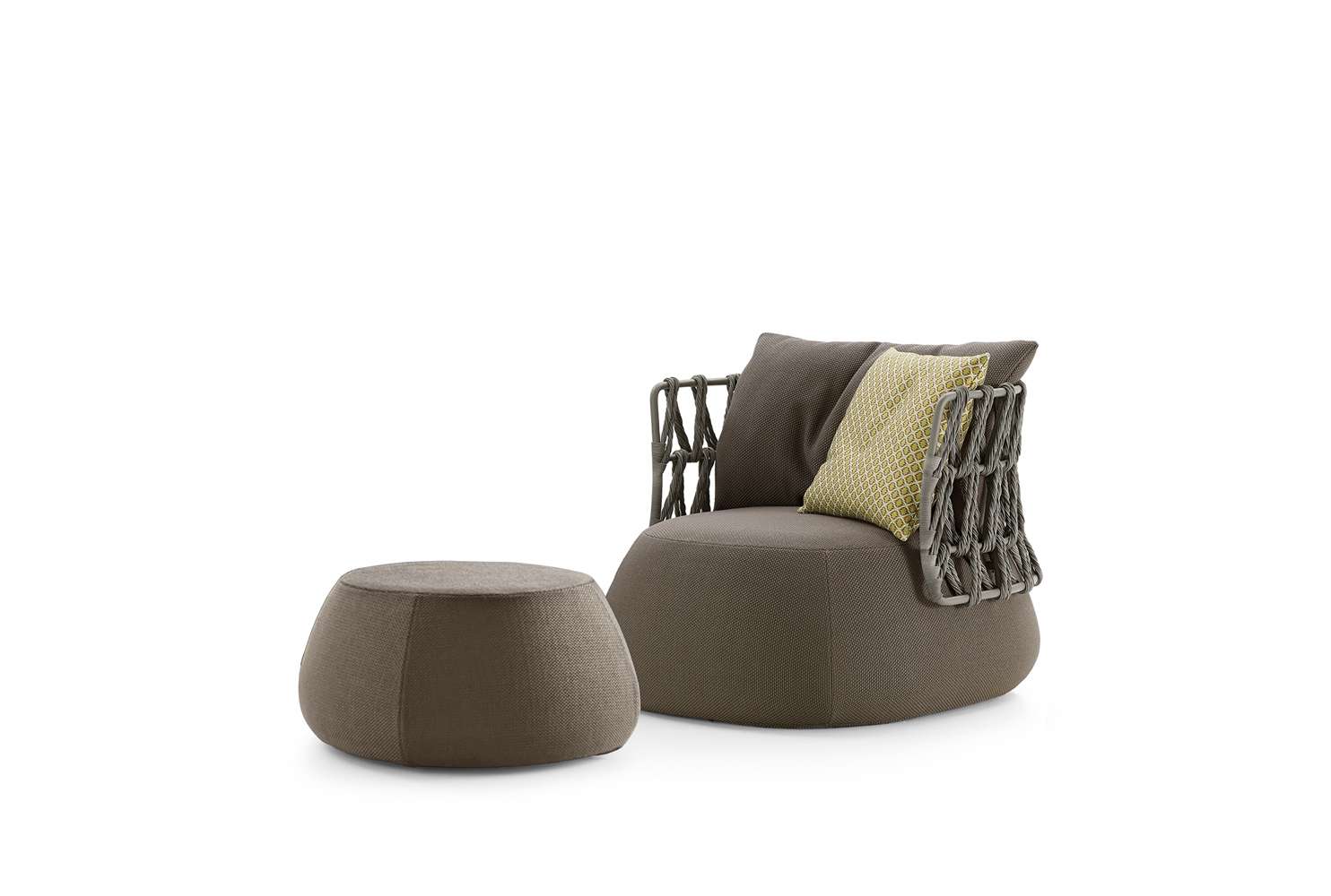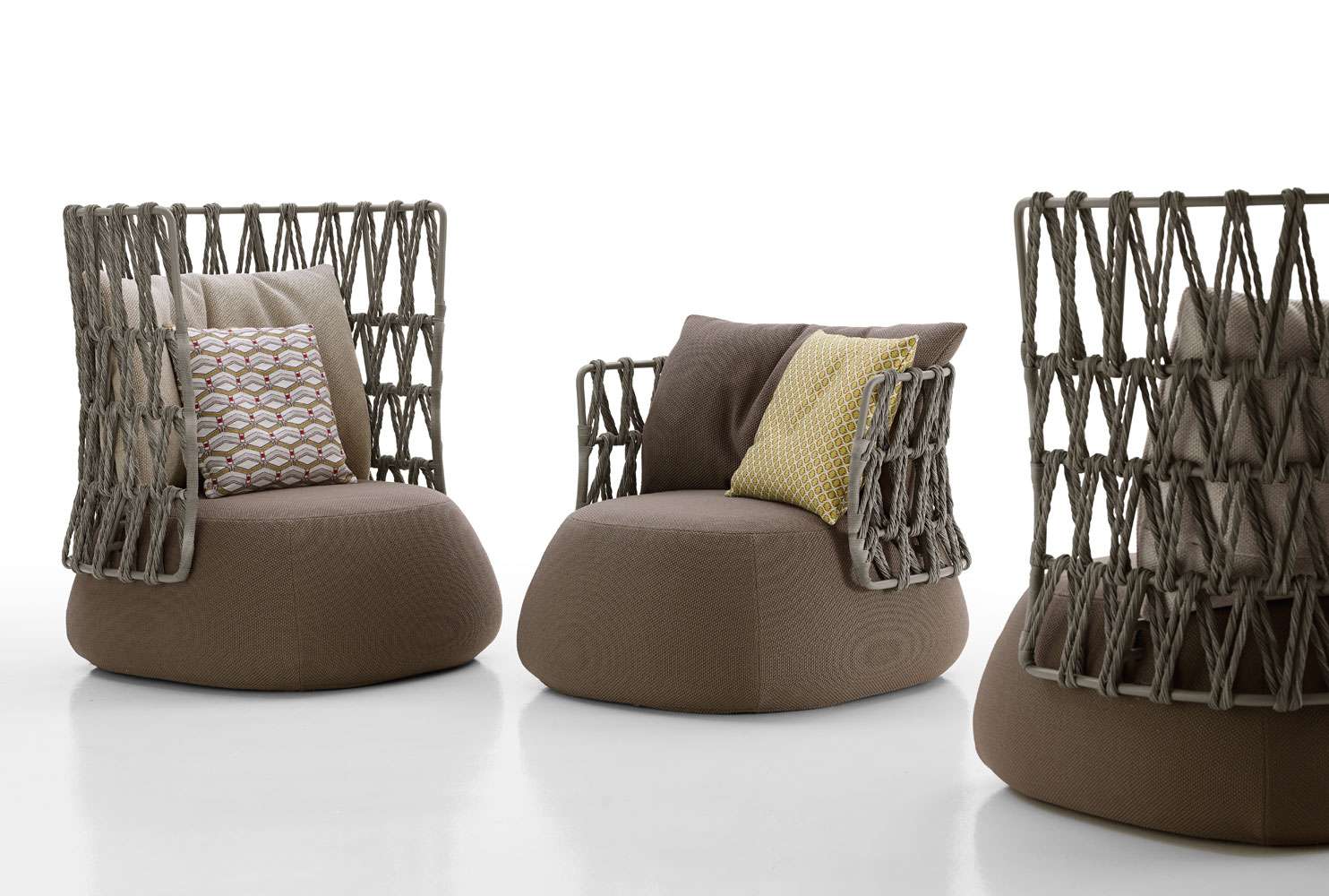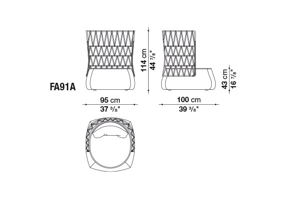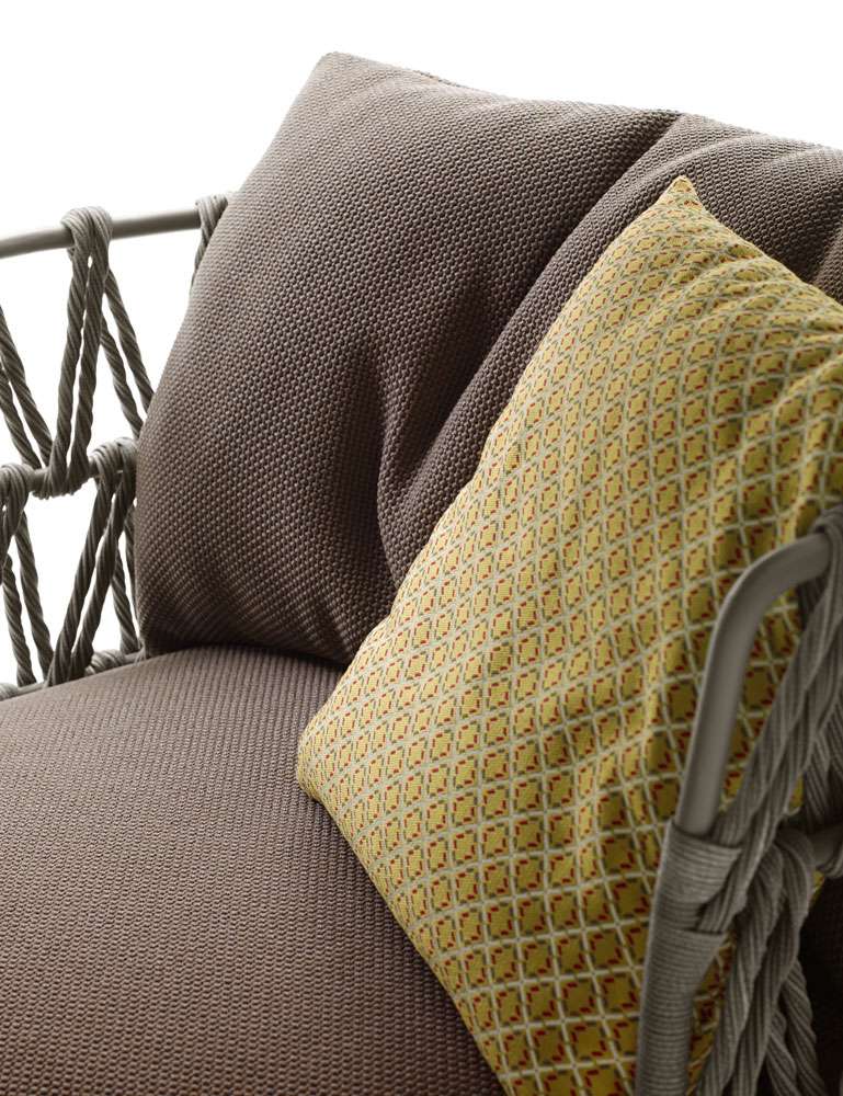 アウトドア仕様のFat-Sofa Outdoor<ファットソファ アウトドア>は、その柔らかな丸みを帯びた形状に加えて編込みがデザインされたことにより斬新になりました。一体型シートとメタルフレームに編込みをほどこしたバックレストが組み合わさることにより、ボリューム感と開放感の相反する2つの印象を同時に味わうことが可能となります。トルトーラカラーのポリエチレンファイバーでできた編込みパターンはとてもユニークでデザイナーが表現したかった“軽さ“と”透過性”は、あらゆる空間との調和を実現しました。タイプは、ソファが2サイズ、ハイバックとローバックのアームチェア、オットマンが2サイズの全部で6種類となります。