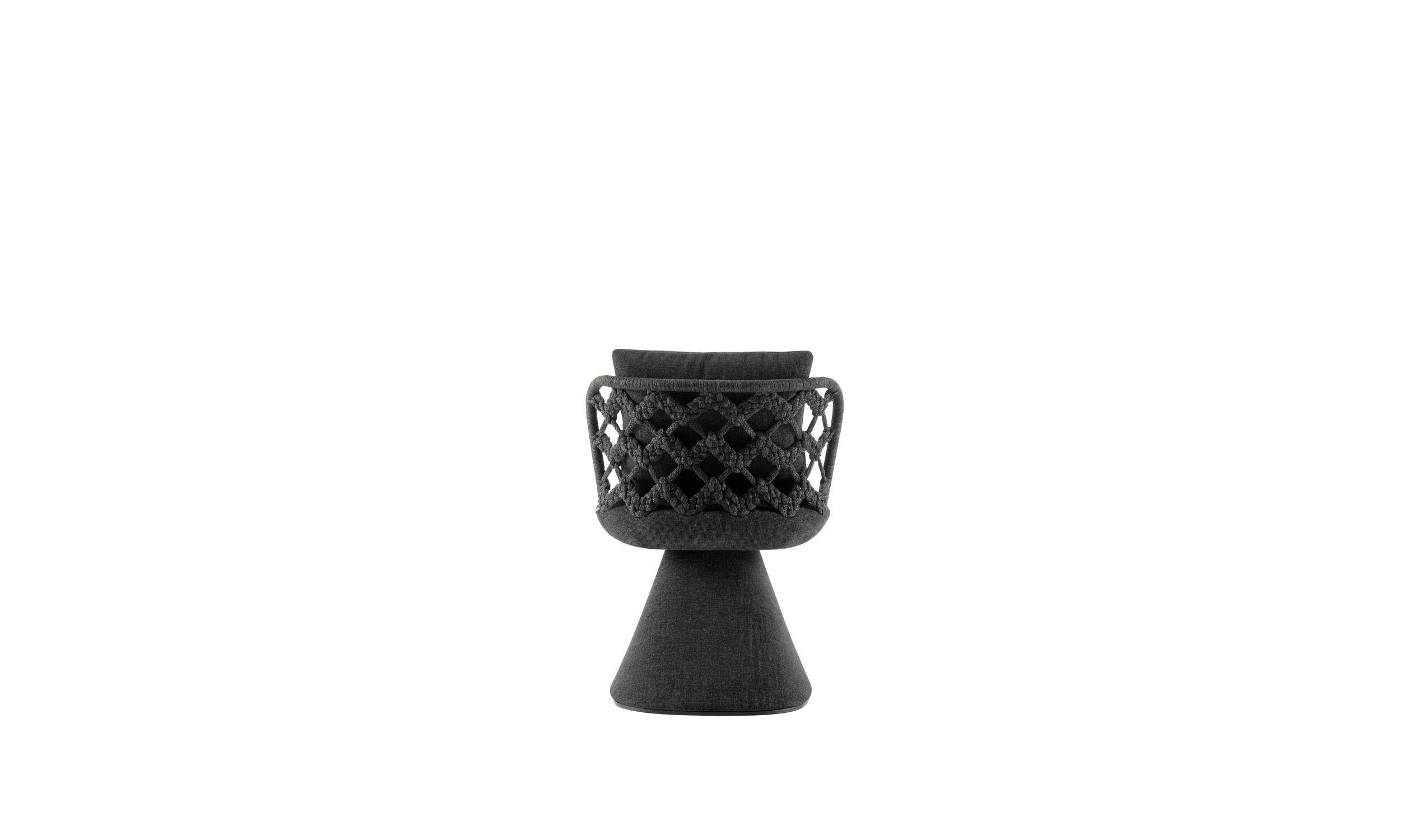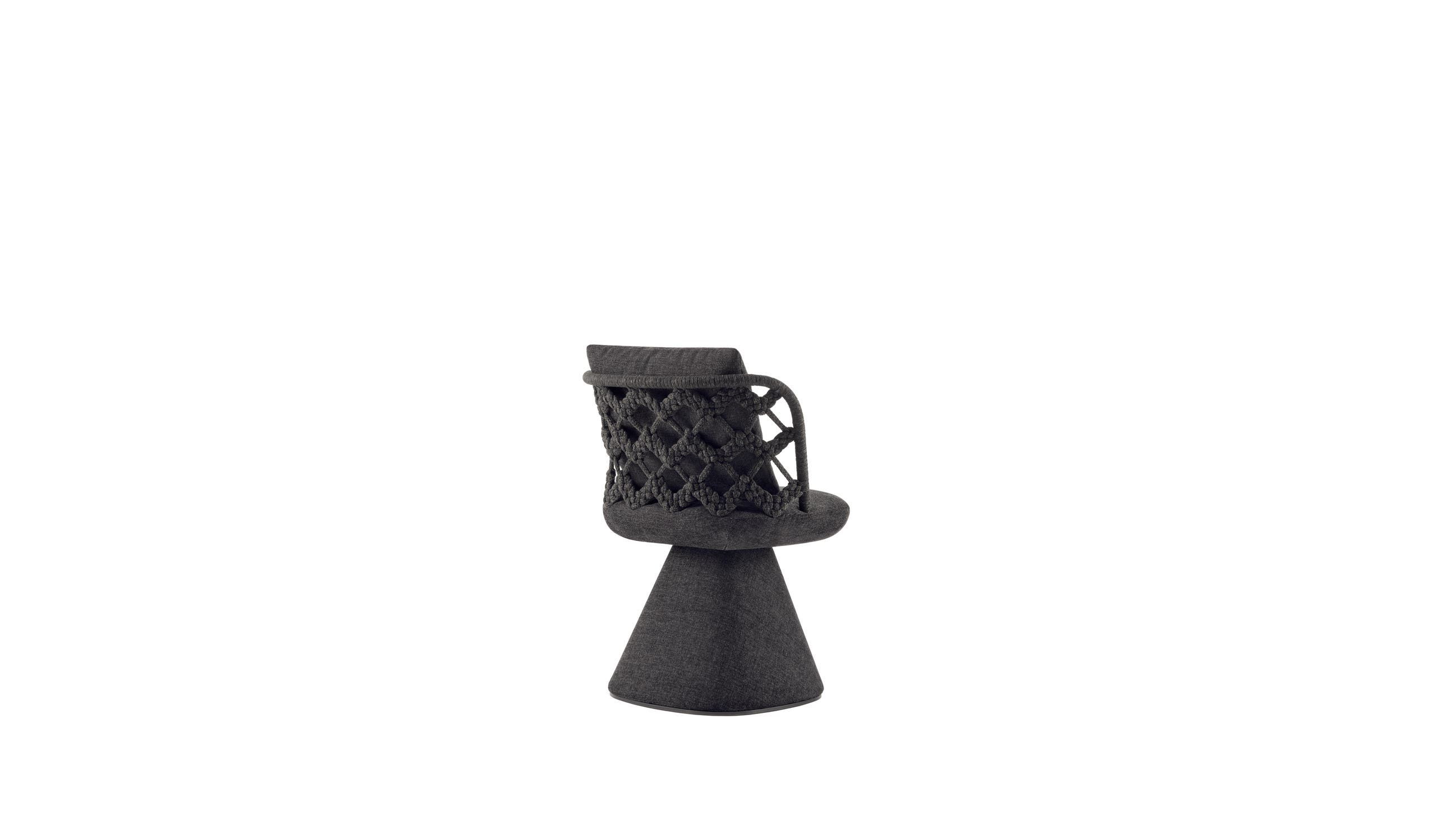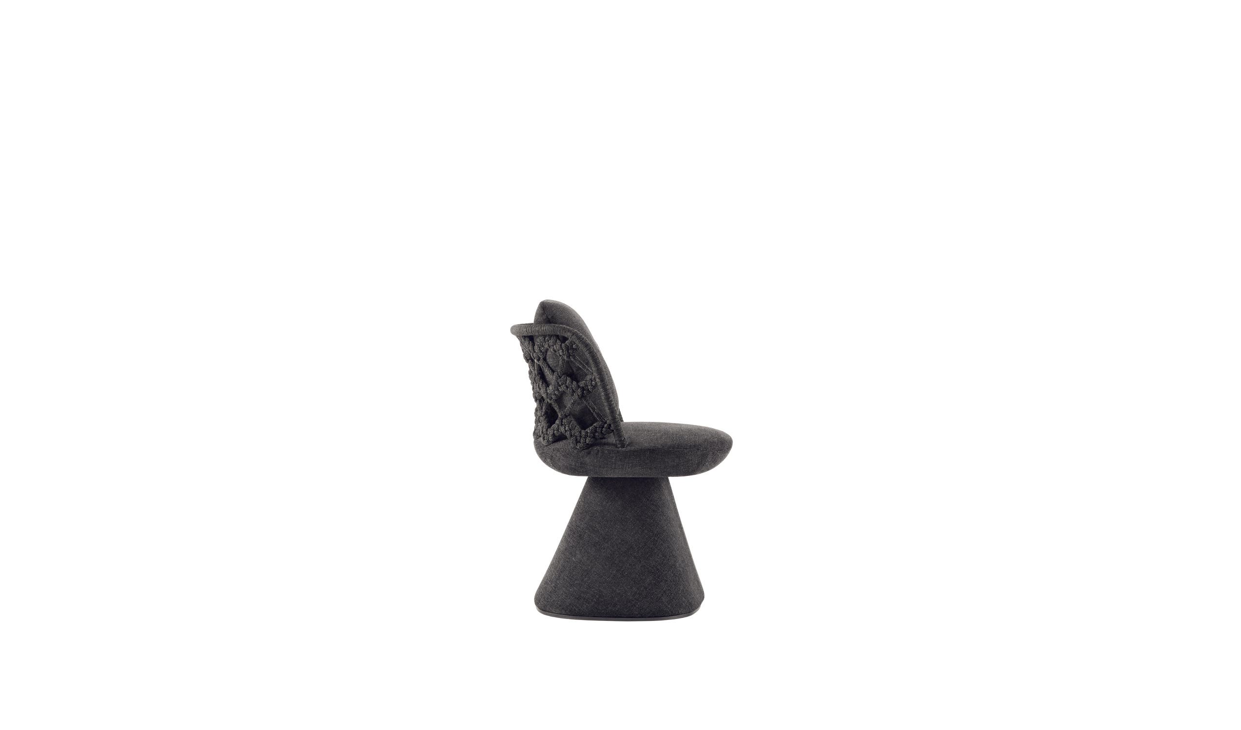 モニカ・アルマーニは、このチェアを改良するために、カントゥーを拠点とし、伝統的な織物技術を現代的に蘇らせ、家具分野に応用することを専門とするデザインスタジオ、unPIZZO(ウンピッツォ)とコラボレーションしました。アルミニウムの背もたれの内部構造は、4色から選べるポリプロピレンのリボンできれいに包まれており、レンズ状の底面を持つ円錐形の脚の上に収まっています。