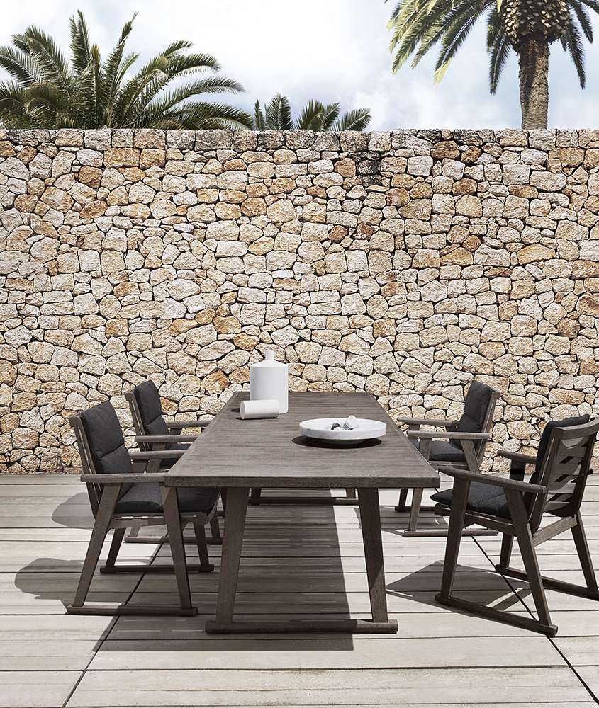 アントニオ・チッテリオがデザインしたGio<ジオ>は、屋外での生活に特化した、コンテンポラリー・クラシックなアクセントを持つシリーズです。ソファ、エンドユニット、シェーズロング、サンベッド、アームチェア、チェア、テーブル、コンプリメントの各シリーズは、チークの無垢材にアンティークグレーの特殊仕上げを施したもので、この仕上げは、木材独特の経年変化後のようなシルバーグレーの質感を与えます。また、風雨からの遮断性を高めるために、パッド部分には防水加工を施したポリエステル製のカバーを使用しており、その生地は耐候性、紫外線、塩素、潮風に対する耐性を備えています。