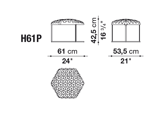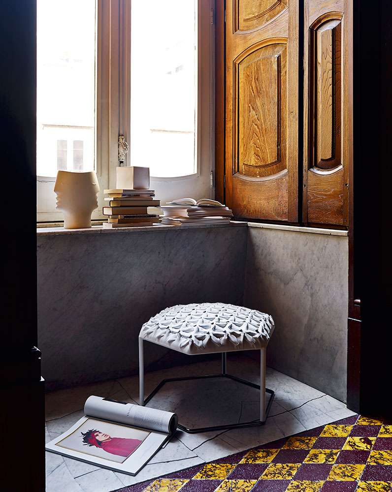 オットマンは、製造工程で発生する小さな革の「葉」を組み立てることで、立体的な表面を実現しています。後者は、折りたたまれた金属のシートから作られています。手作りの技術と幾何学模様が、蜂の巣の構造からインスピレーションを得たこのアクセサリーのグリーンコールを高めています。