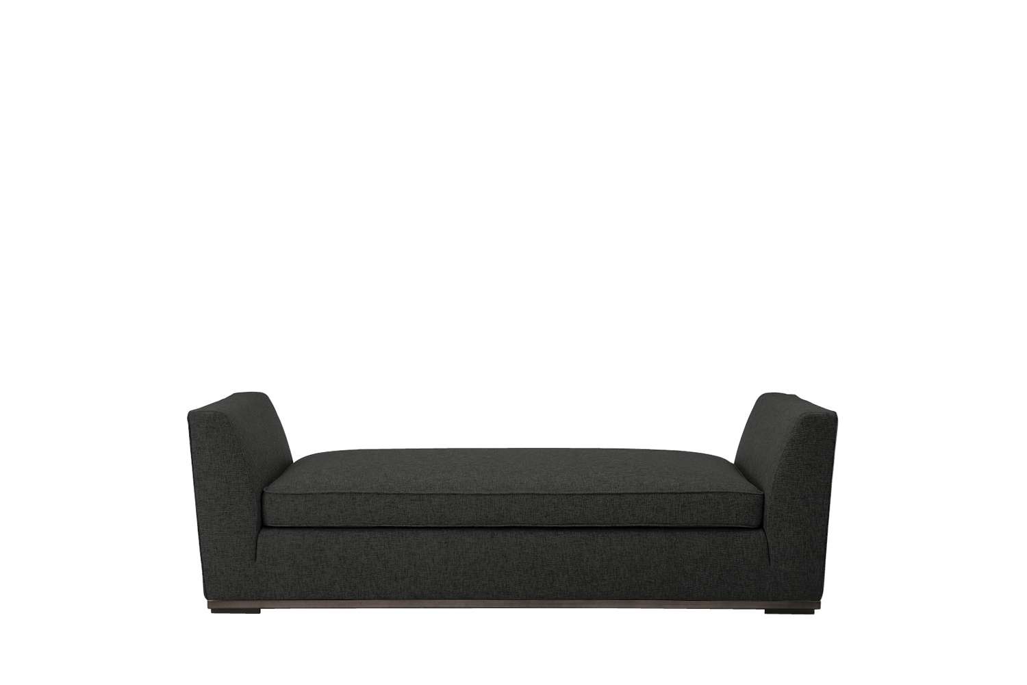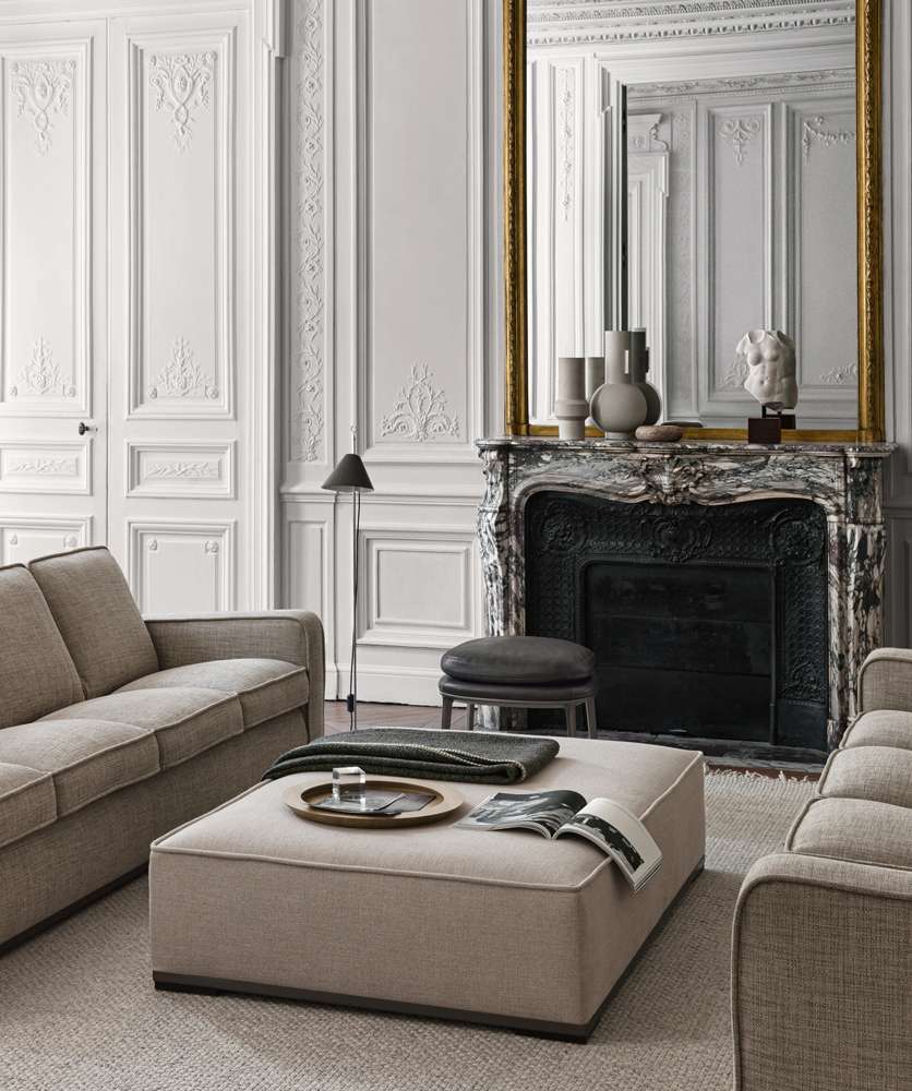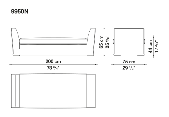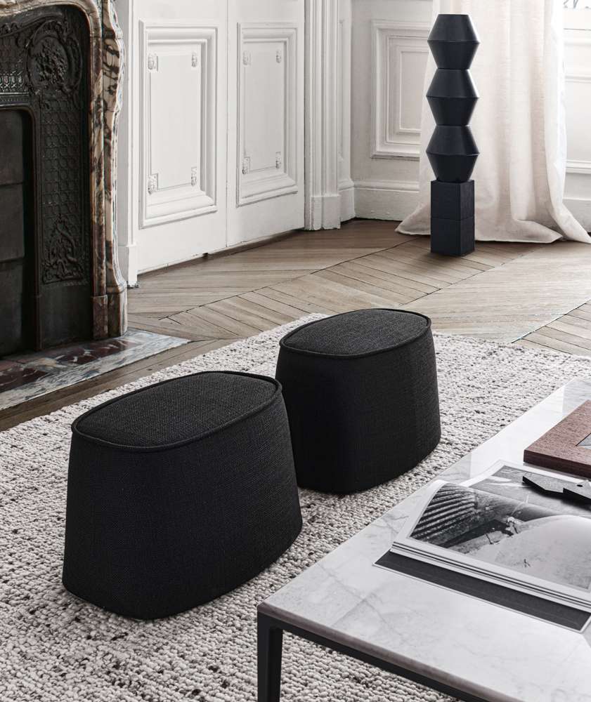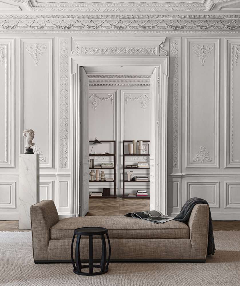 The dormeuse for mid-room placement and the ottoman are elements that go with several sofas and armchairs of the Apta collection thanks to a detail present on many of the items: the lower edge in bronzed nickel painted steel.