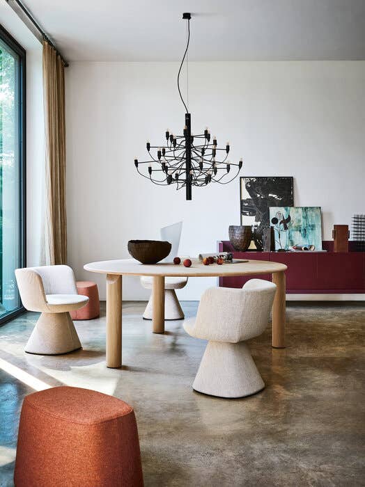 Isosは、さまざまなサイズの円形、楕円形、長方形の天板が選べ、3本、4本、または6本の脚が通常とは異なる配置で設置されています。脚部にはマルキニアブラックマーブル、カッラーラホワイトマーブル、または異なる仕上げのオーク材(ライト、ブラック、グレー)が用意され、天板には超軽量透明ガラスと組み合わせることができます。また、Isosは全て木材でできたものもあり、天板と脚部がライト、ブラック、グレーのオーク材で作られるこのモデルは、空間に温かみと自然な雰囲気を加える選択肢となっています。