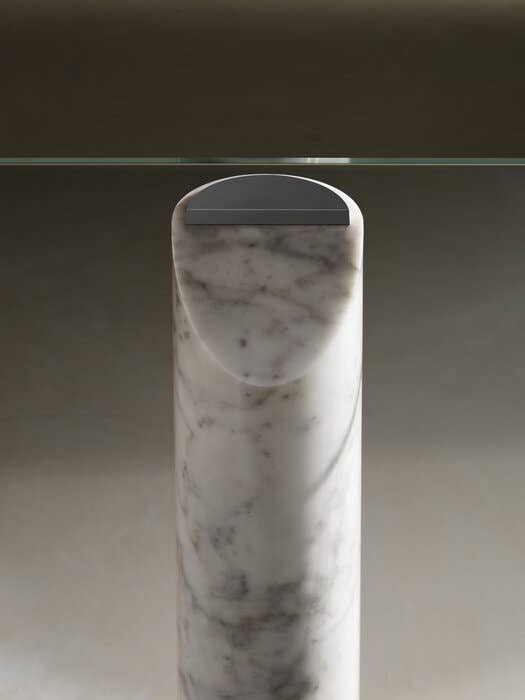 <Isos (イソス)>テーブルは、透明感と視覚的な軽やかさをテーマに誕生しました。その特徴は円柱形の脚部にあり、これらは荷重を支える要素でありながら、洗練されたデザインのディテールを楽しめます。脚部の先端はノミで削られたような形状をしており、スチール製プレートを介して天板に接続されることで、堅牢性とスタイルを両立しています。天板の丸みを帯びた輪郭が、全体のデザインに柔らかさと上品さを加えています。