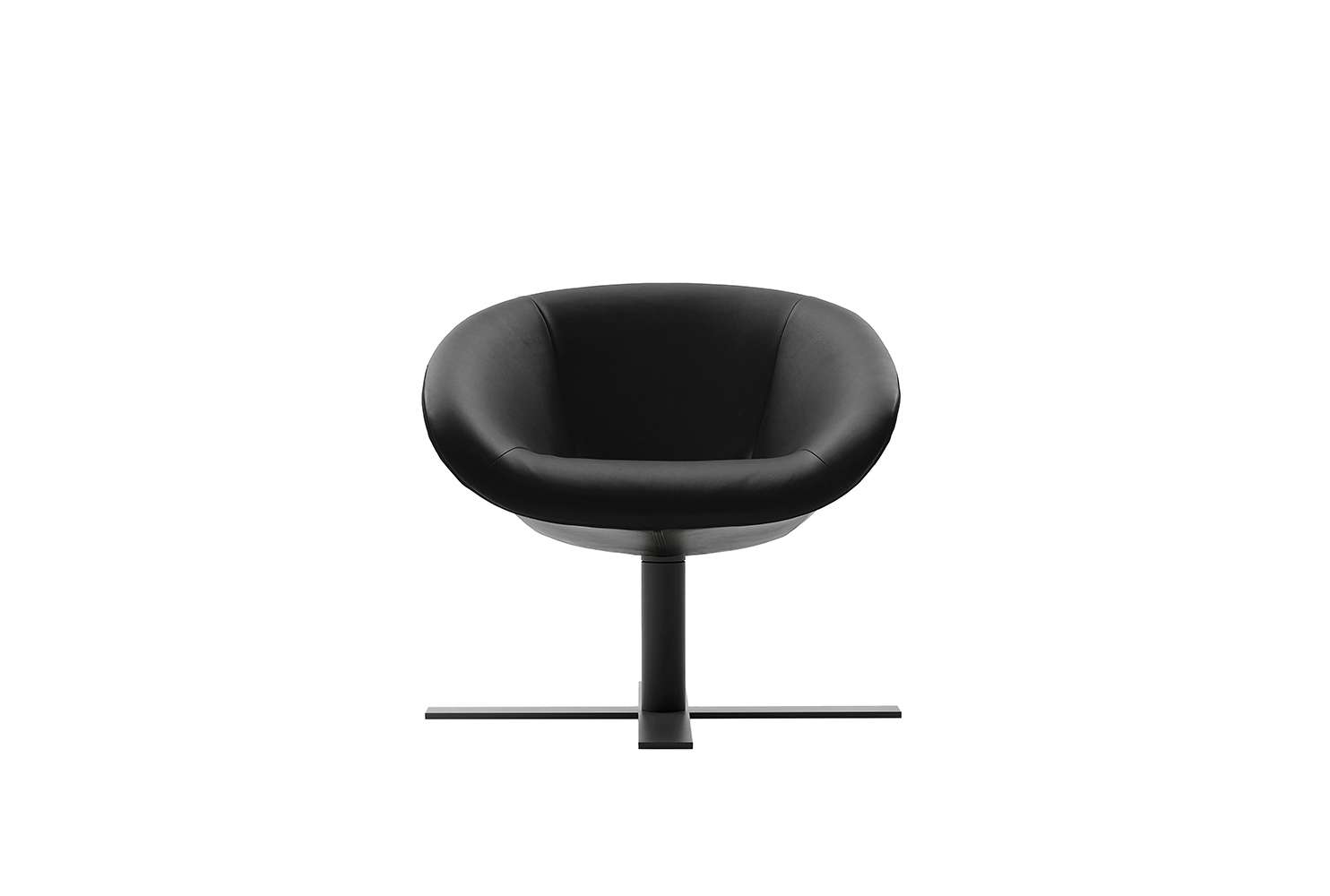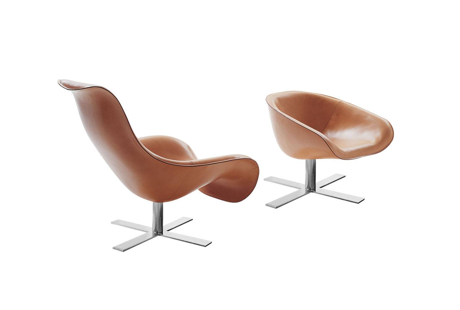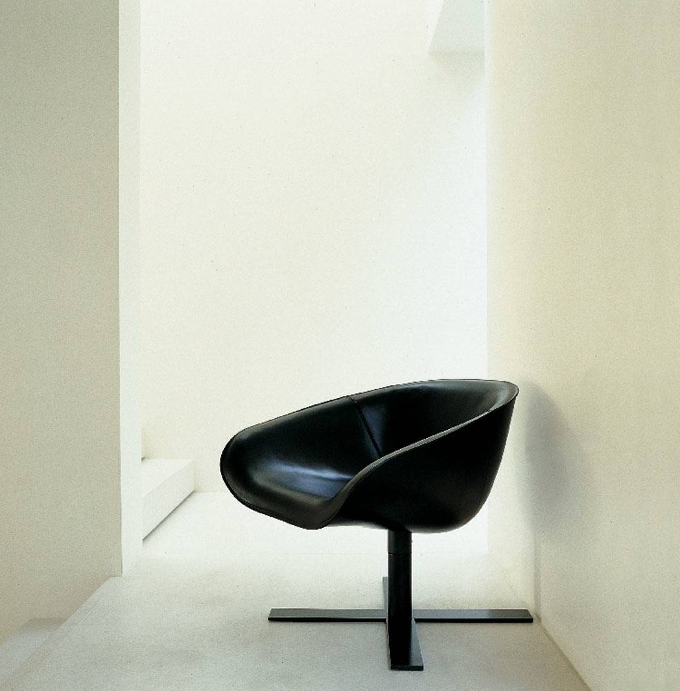 多くの研究を経て開発されたMartには、厚手のレザーを熱成形する技術が駆使されています。サイズはスモールタイプと、スウィーベル機能付きのクロス ベースが付いたラージタイプの2種類をご用意しております。3種類のベースフレームがあり、クロームメッキ仕上げ、ブラックスチール、ブロンズニッケル 塗装からお好きなものをお選びいただけます。また、背もたれ手動で簡単に2段階リクライニングできます。マートシリーズはフォルムや素材の組み合わせ を変えることにより、豊富なパターンをお楽しみいただけます。厚手のレザーを使用したスウィーベル・アームチェアに使用されるクロスベースフレームに は、クロームメッキ仕上げ、ブラッククローム仕上げ、またはブロンズニッケル塗装が施されております。ファブリック地のアームチェアには同じ十字状の ベースフレームが使われていますが、色はプラム、マスタードイエロ-、ブラックなど明るい色が加わっています。スモールタイプはレザーとファブリック から選択可能で、スモークドオークのスポーク4本が付いた回転式のベースフレームを使用しています。