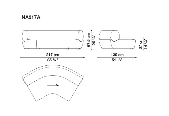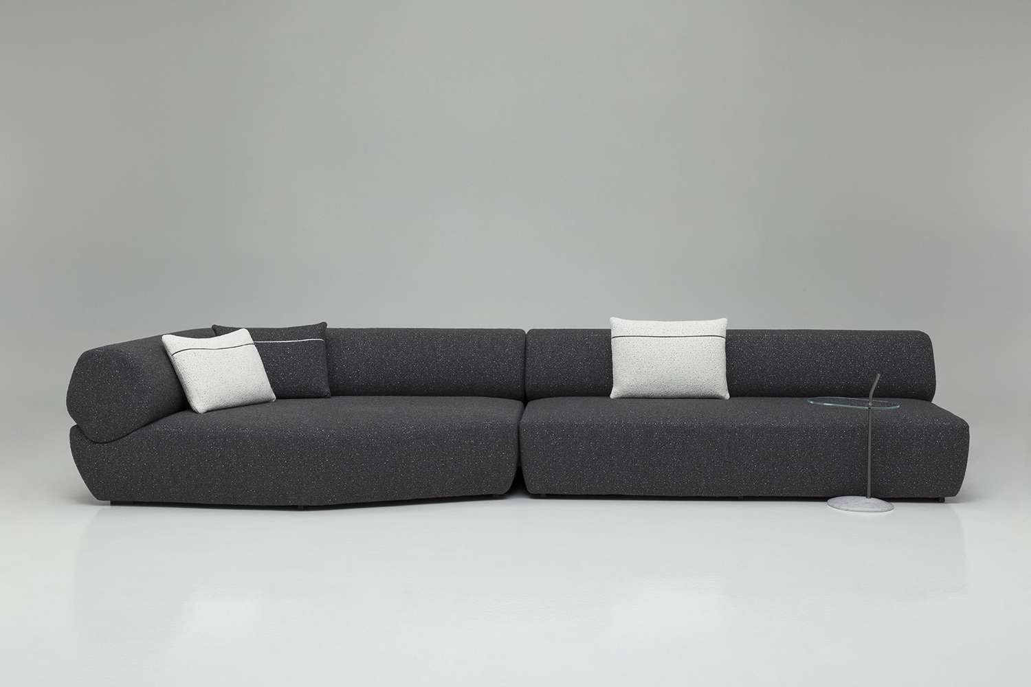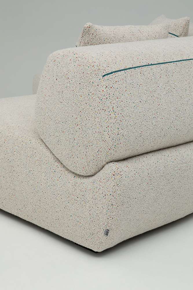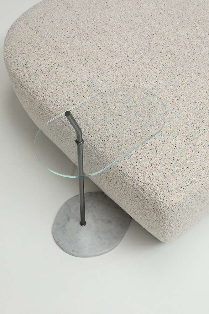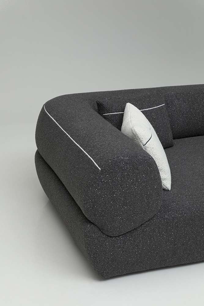 Yabu PushelbergのNaviglioコレクションは、曲線、直線、長椅子、オットマンなどの要素で構成されており、それらが一体となって構造と形態の間の視覚的な対話を表現しています。この合成はプロジェクトの本質であり、その名前から始まっています。水路は出会いと合流の場であり、貿易とレジャー、人間の介入と自然との触れ合いを統合するものです。これは、デザイナーのジョージ・ヤブとグレン・プシェルバーグがB&B Italiaと初めてパートナーシップを結んだときの出発点でした。カナダ人デザイナーの構想では、シーティングのベースは川床であり、水路のようにしなやかな背もたれとアームレストを収容するための空間を定義しています。Yabu Pushelbergのデザインは、有機的なフォルムとB&B Italiaの成形技術との間に関係を築き、一貫性のある統一された全体像を創り出しています。パズルのピースのように、B&B Italiaのチームは各形状を人間工学的にデザインし、一つのまとまりを実現しました。背もたれ部分と座面の形状は、多角形と曲線の微妙なバランスを表しており、幾何学性が柔らかさとなり、厳格さが快適さと調和しています。背もたれは丸い形をしていますが、実際にはエッジが丸くなった不規則な多角形で、驚きと安心感を与えるディテールです。各パーツの張り地には高密度のポリウレタンが使用されており、身体を心地よく包み込み、最適なサポートを実現しています。シートクッションのないソファという商品特性を考慮した上での選択です。ナヴィリオの椅子張り製品には、統一されたベースに、アクションペインティングのダイナミズムや印象派の色の組み合わせを思わせる多色の炎が描かれた新しいブークレーがあります。ホワイト、グレー、ブラック、トルトラカラーが相互に作用する、光と影の絶妙な絵画的相互作用を持つ新しいファブリックの5つのバリエーションがコレクションに加わりました。背もたれの後面には、同色または対照的な連続した装飾部分があり、形状の連続性をさらに強調する直線的な要素となっています。 また、Yabu Pushelberg studioがデザインしたサービステーブル「Naviglio」は、透明なガラスの天板をシートの近くに設置することができます。ブロンズ仕上げのニッケル製の細い垂直軸を、川の石をイメージした磨き上げられた大理石の台座が支えています。
