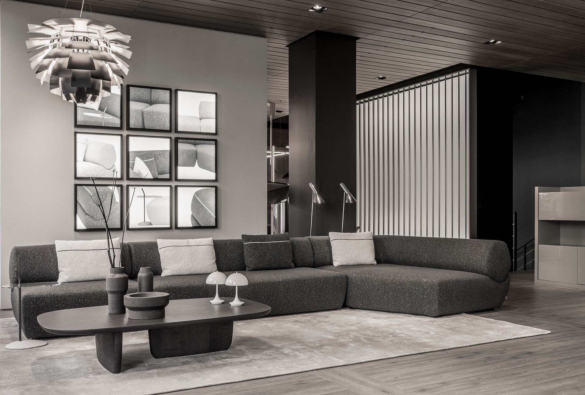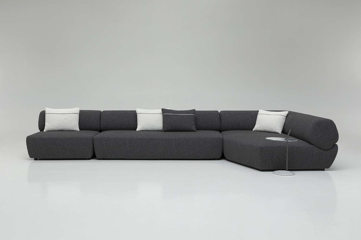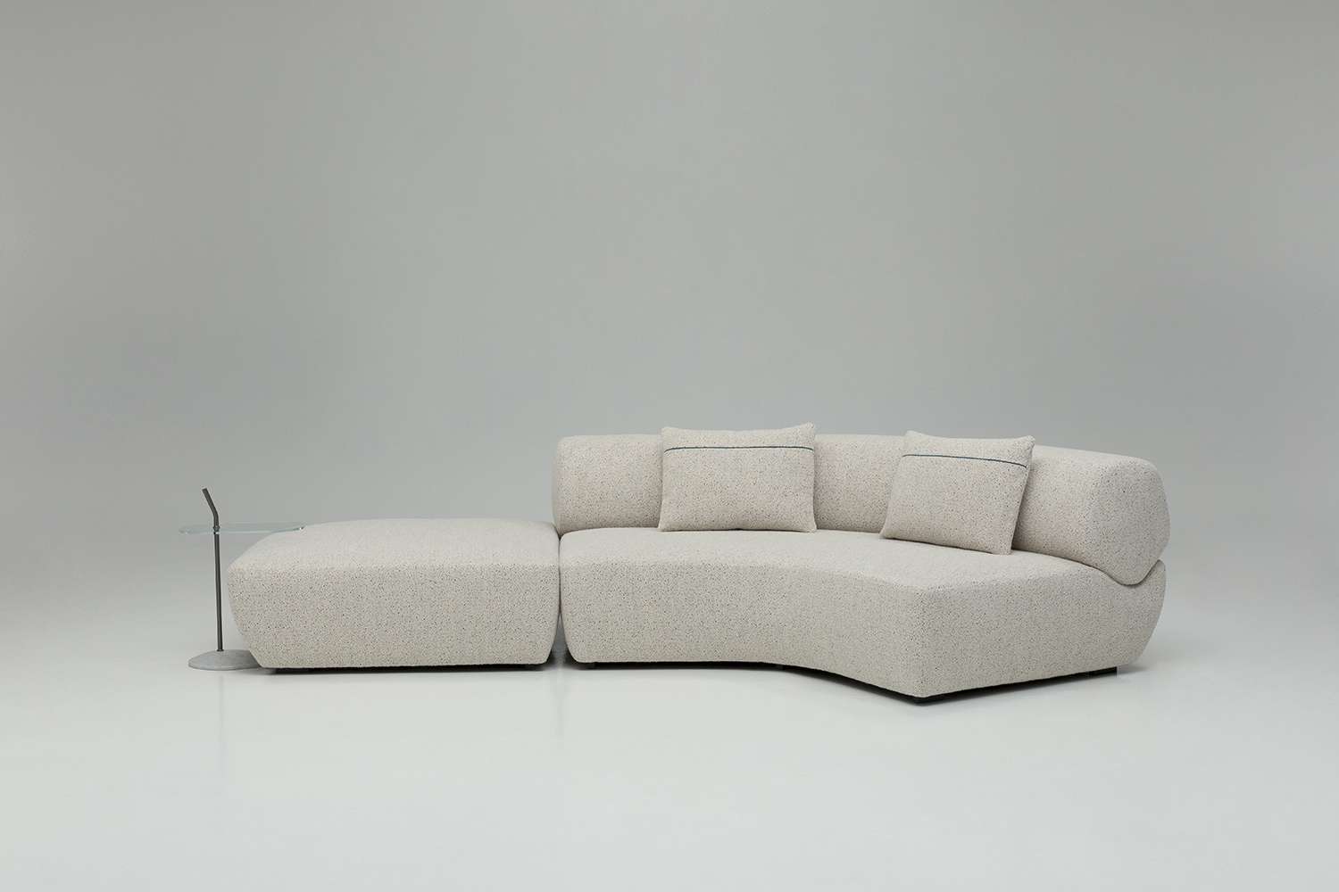Yabu PushelbergのNaviglioコレクションは、曲線、直線、長椅子、オットマンなどの要素で構成されており、それらが一体となって構造と形態の間の視覚的な対話を表現しています。この合成はプロジェクトの本質であり、その名前から始まっています。水路は出会いと合流の場であり、貿易とレジャー、人間の介入と自然との触れ合いを統合するものです。これは、デザイナーのジョージ・ヤブとグレン・プシェルバーグがB&B Italiaと初めてパートナーシップを結んだときの出発点でした。カナダ人デザイナーの構想では、シーティングのベースは川床であり、水路のようにしなやかな背もたれとアームレストを収容するための空間を定義しています。Yabu Pushelbergのデザインは、有機的なフォルムとB&B Italiaの成形技術との間に関係を築き、一貫性のある統一された全体像を創り出しています。パズルのピースのように、B&B Italiaのチームは各形状を人間工学的にデザインし、一つのまとまりを実現しました。背もたれ部分と座面の形状は、多角形と曲線の微妙なバランスを表しており、幾何学性が柔らかさとなり、厳格さが快適さと調和しています。背もたれは丸い形をしていますが、実際にはエッジが丸くなった不規則な多角形で、驚きと安心感を与えるディテールです。各パーツの張り地には高密度のポリウレタンが使用されており、身体を心地よく包み込み、最適なサポートを実現しています。シートクッションのないソファという商品特性を考慮した上での選択です。ナヴィリオの椅子張り製品には、統一されたベースに、アクションペインティングのダイナミズムや印象派の色の組み合わせを思わせる多色の炎が描かれた新しいブークレーがあります。ホワイト、グレー、ブラック、トルトラカラーが相互に作用する、光と影の絶妙な絵画的相互作用を持つ新しいファブリックの5つのバリエーションがコレクションに加わりました。背もたれの後面には、同色または対照的な連続した装飾部分があり、形状の連続性をさらに強調する直線的な要素となっています。 また、Yabu Pushelberg studioがデザインしたサービステーブル「Naviglio」は、透明なガラスの天板をシートの近くに設置することができます。ブロンズ仕上げのニッケル製の細い垂直軸を、川の石をイメージした磨き上げられた大理石の台座が支えています。