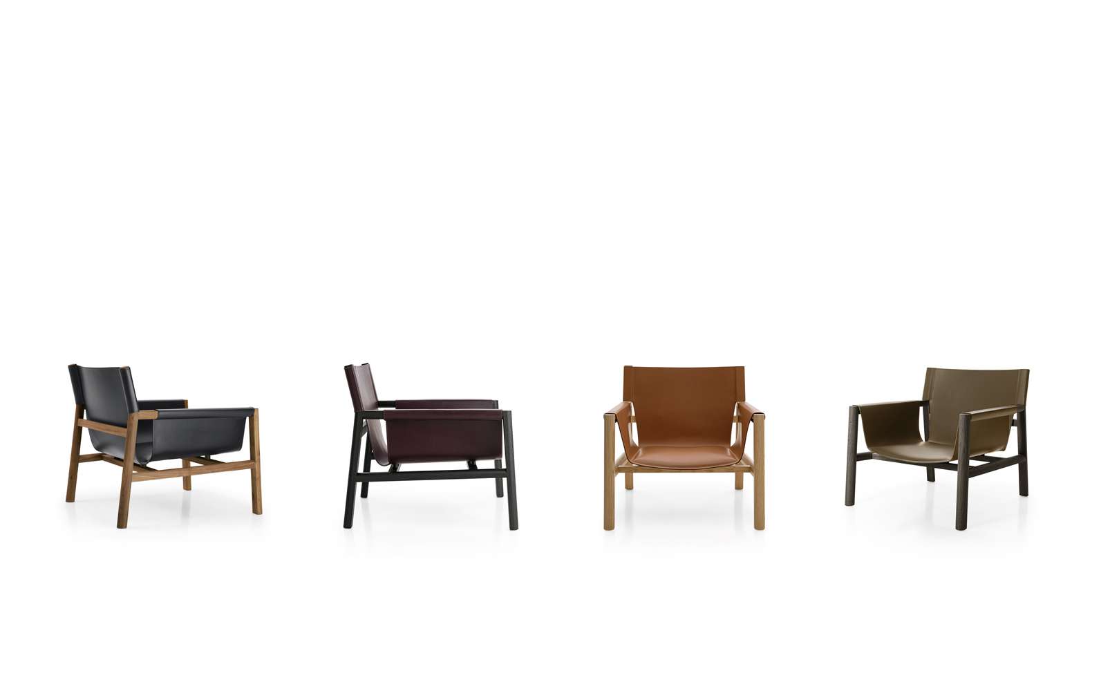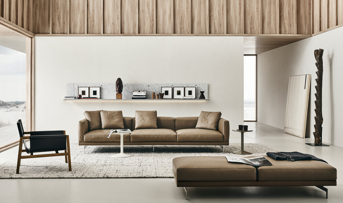 Pabloの特徴は座った時の心地良さと、座る人をしっかり支える頑丈さ。その2つの特徴により、美しく衝撃に強い構造を実現しています。シートには2層のレザーが施され、見た目には分からないほど薄いパッディングを採用。それにもかかわらず、座り心地の良さは抜群です。思わず目をとめるフォルムはシートの深さとやや傾いたフロントが特徴です。ミリ単位まで計測することにより、Pabloは新たなプロポーションを提案。アームチェアとシェーズロングの中間に位置する革新的なチェアを実現しました。座る人の体を包み、抱き止めるような構造は、バックレストにフィットし、アームレストに挟まれる感覚が、まるで空を飛んでいるような気分を演出します。デザイナーの細部へのこだわりは、お客さまに愛される優れた製品には多くの努力と細やかな心配りが必要であるというB&B Italia研究開発センターのコンセプトです。その姿勢は、直線と曲線が連続する印象的なデザインのほか、木の軽さ、切りっぱなしのレザーの力強さ、そして構造部の直線的なフォルムとそれを少し和らげてくれる滑らかな曲線部分が織りなす物語の中にはっきりと表現されています。まるで吊り橋や魔法の絨毯のよう。安らぎを与えてくれるこのアイテムは、ビジュアルは斬新でありながら、エレガントで快適。絶妙なバランスを実現しています。