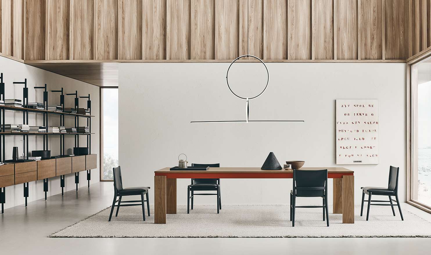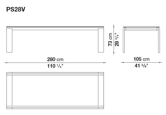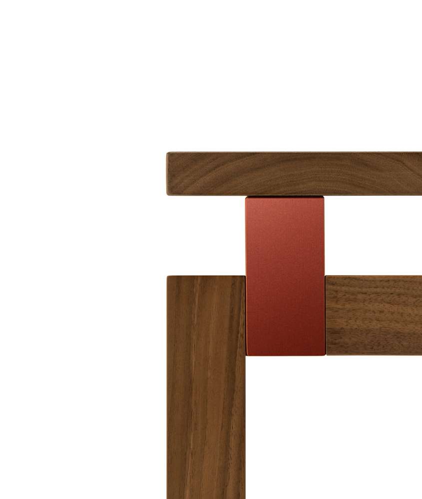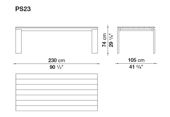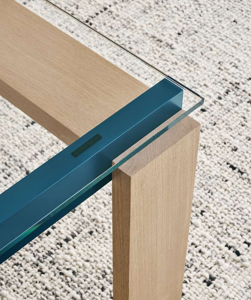 マイケル・アナスタシアデスが、B&B Italia のために初めてデザインしたテーブルのコンセプトは、2本の印象的なアルミニウムの梁材が両側で結合され支えられているというものです。基本の構造は、極めてミニマルで本質的な考え方に基づいていて、コンセプトがそのまま実体化したようなものです。究極のシンプリシティを追い求めていくと、時に最先端の技術的な解決法を見つけ出さなければならず、Parallel Structure<パラレル ストラクチャ>は、まさにその完璧な例となっています。このプロジェクトの純粋さに着目するなら、純粋な形状の構造部材と異なる素材の組み合わせによる接合部のクリーンな関係性に多大なる配慮がされていることです。脚部は、無垢の木材で作られていますが、サイドサポートは、電解着色されたアルミニウムのアーキトレーブ(梁状)に接合されて金属のコアを隠すようにソリッドさを与えて、構造の視覚的な軽さを実現しています。コレクションは、2つのサイズと異なる素材が天板に用意されています。カナレット・ウォールナットとライトオーク、グレーオーク、ブラックオーク、そしてスモークドオークの4種類のオークのバリエーションです。さらにミニマルで美的なチョイスとして好評なガラスの天板が用意されていて、よりエンジニアリング的な美しさが透過性のある素材によってより強調されることになります。このテーブルは、明快な単純さで余分な要素を全て消し去ることで、純粋でモノリシックな存在を創り出しているのです。名前の由来であるParallel Structure<パラレル ストラクチャ>は、デザインの世界に建築的なアプローチを自然な形で持ち込んだものなのです。