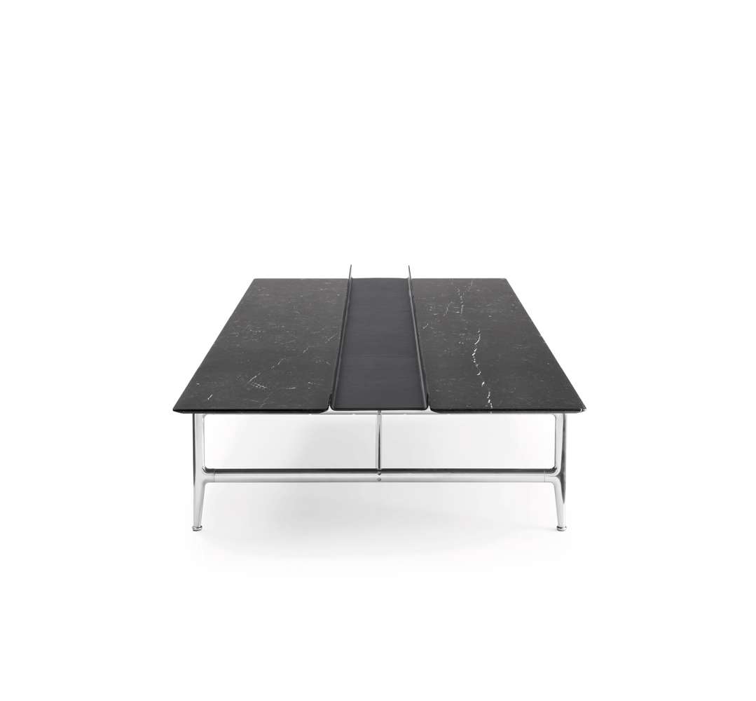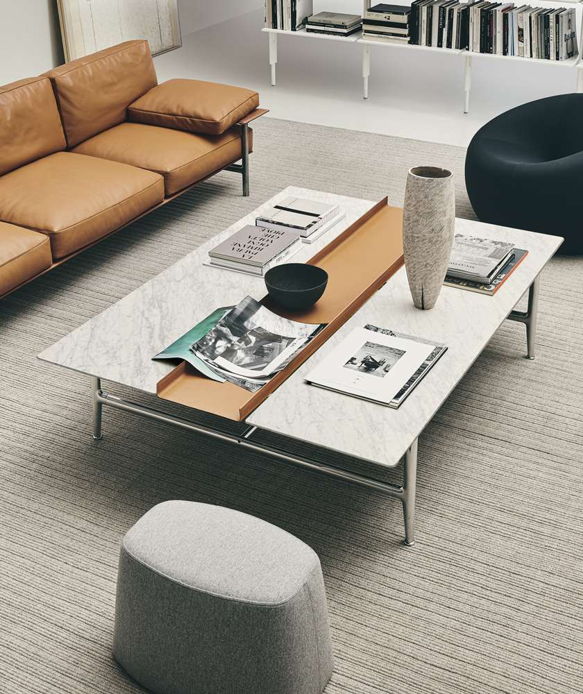 正方形でも長方形でも、Pianura<ピアヌーラ>ローテーブルは、本質的で洗練された機能を備えており、フォーマルなエレガンスの提案に命を吹き込んでいます。大理石の天板とアルミニウム製の構造体で、天板と一体化した厚手のレザートレイも用意されています。また、天板と構造体の両方に数多くの仕上げを施すことができます。