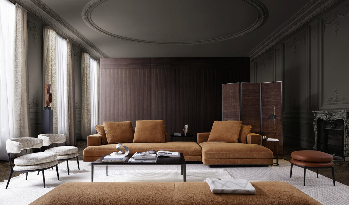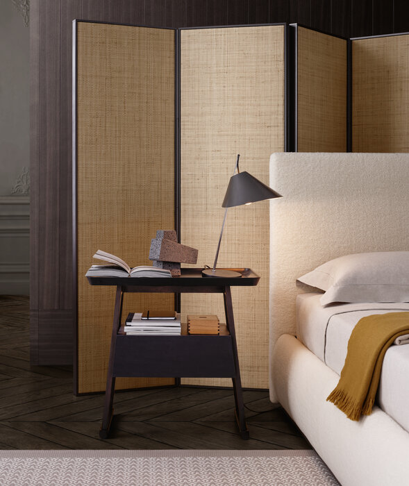 補完的な存在である<Privatus (プリヴァトゥス)>ですが、邸宅の大部屋において、空間を仕切るニーズに応えています。例えばお客様をお迎えする場とダイニングエリアの間や、ベッドのヘッドボードの後ろに置いて、寝室エリアと区分することなどに使用できます。スクリーンはハンドメイドで天然素材のラフィア、裏地にはバナナの葉で構成された生地でできており、支柱に固定されしっかりとした安定感があります。その素材からスクリーンは多少音を吸収し、圧迫感を与えることなく素材感を感じることができます。フレームはブロンズニッケルと塗装アルミニウム製。スクリーンは3枚、4枚、また8枚のタイプがあります。