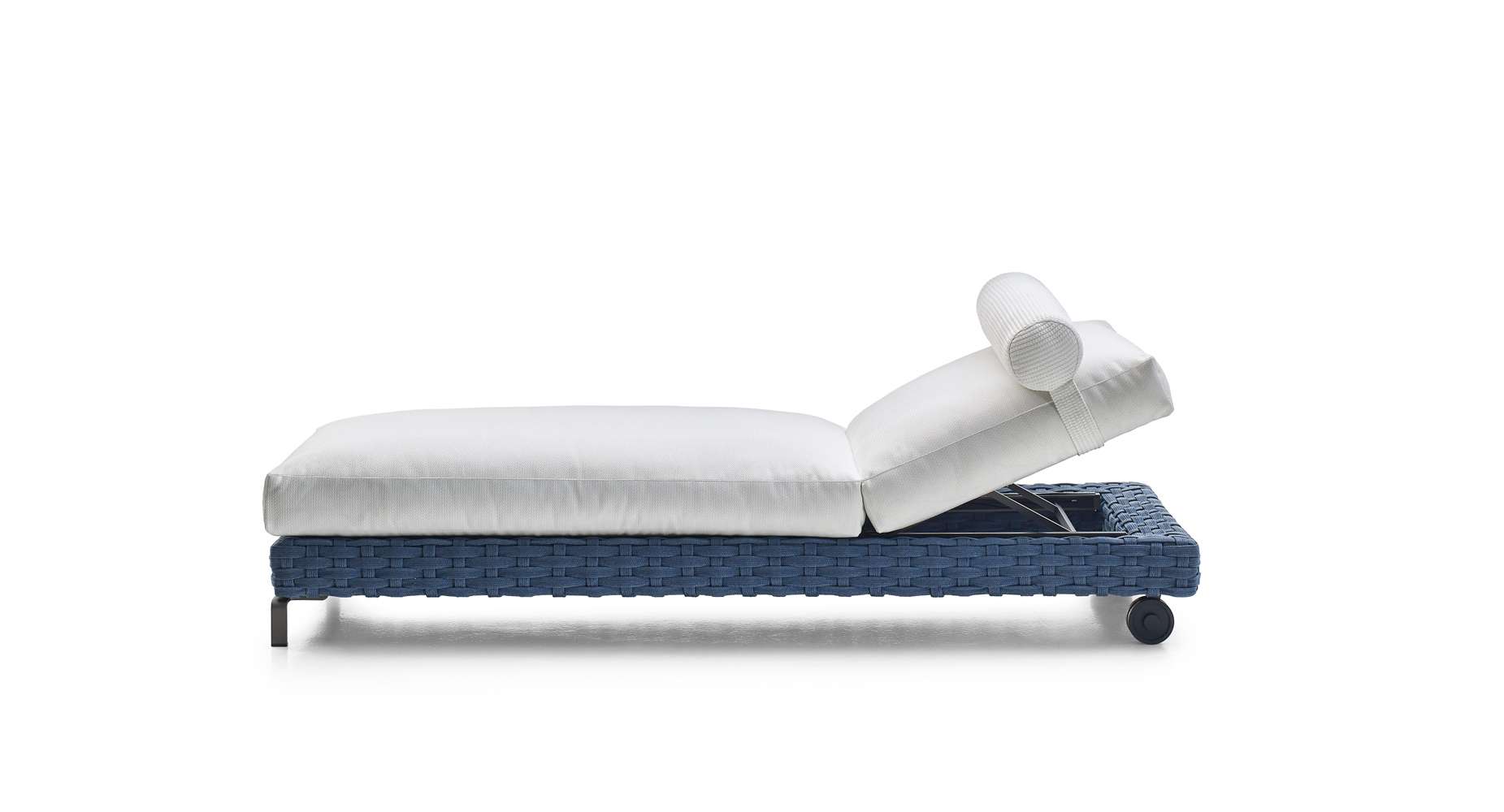 Ray Outdoor Fabric<レイ アウトドア ファブリック>のシェーズロングは、同名の屋外用チェアのコレクションを補完するもので、ポリプロピレン繊維を用いて織り成すリボン模様が特徴です。豊富なカラーバリエーションは、特に屋外環境に適しています。シェーズロングには、アルミニウム製の脚部と、移動を容易にする車輪が付いています。背もたれは様々な位置に調整でき、快適な座り心地を実現します。