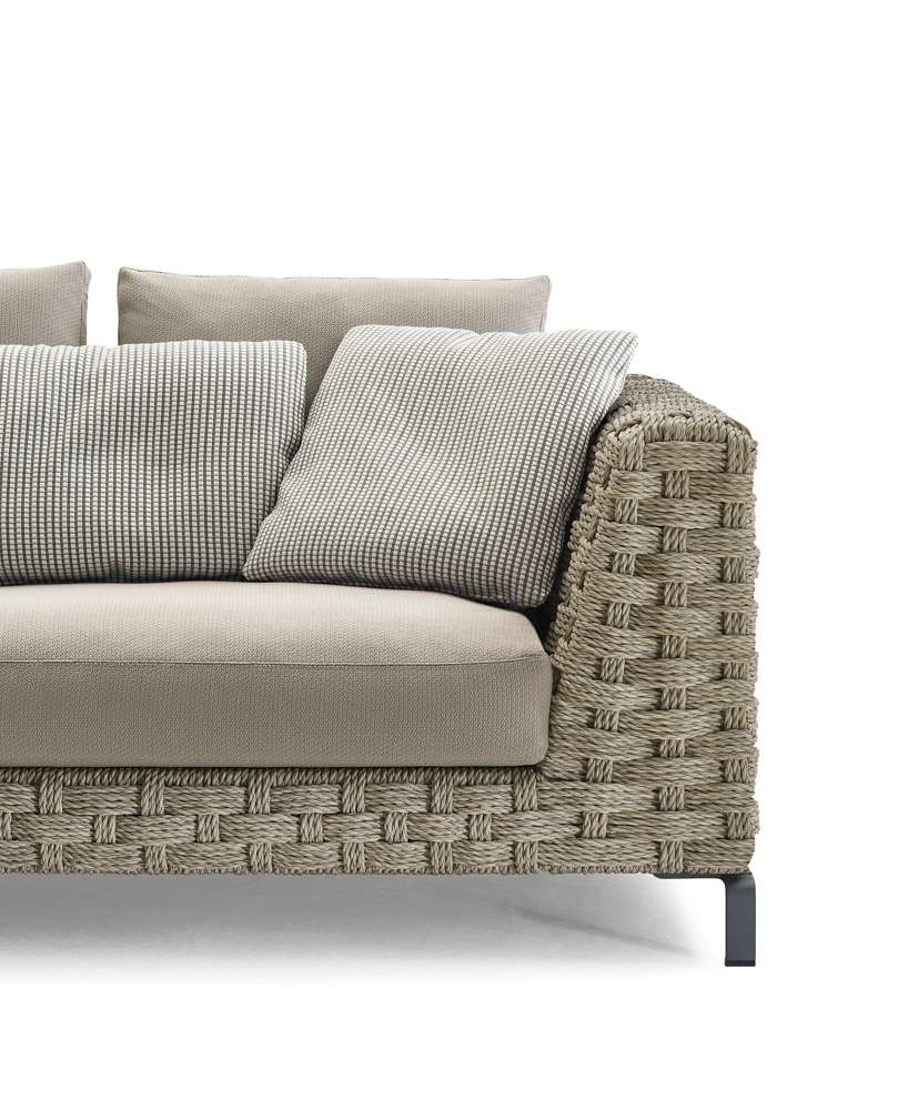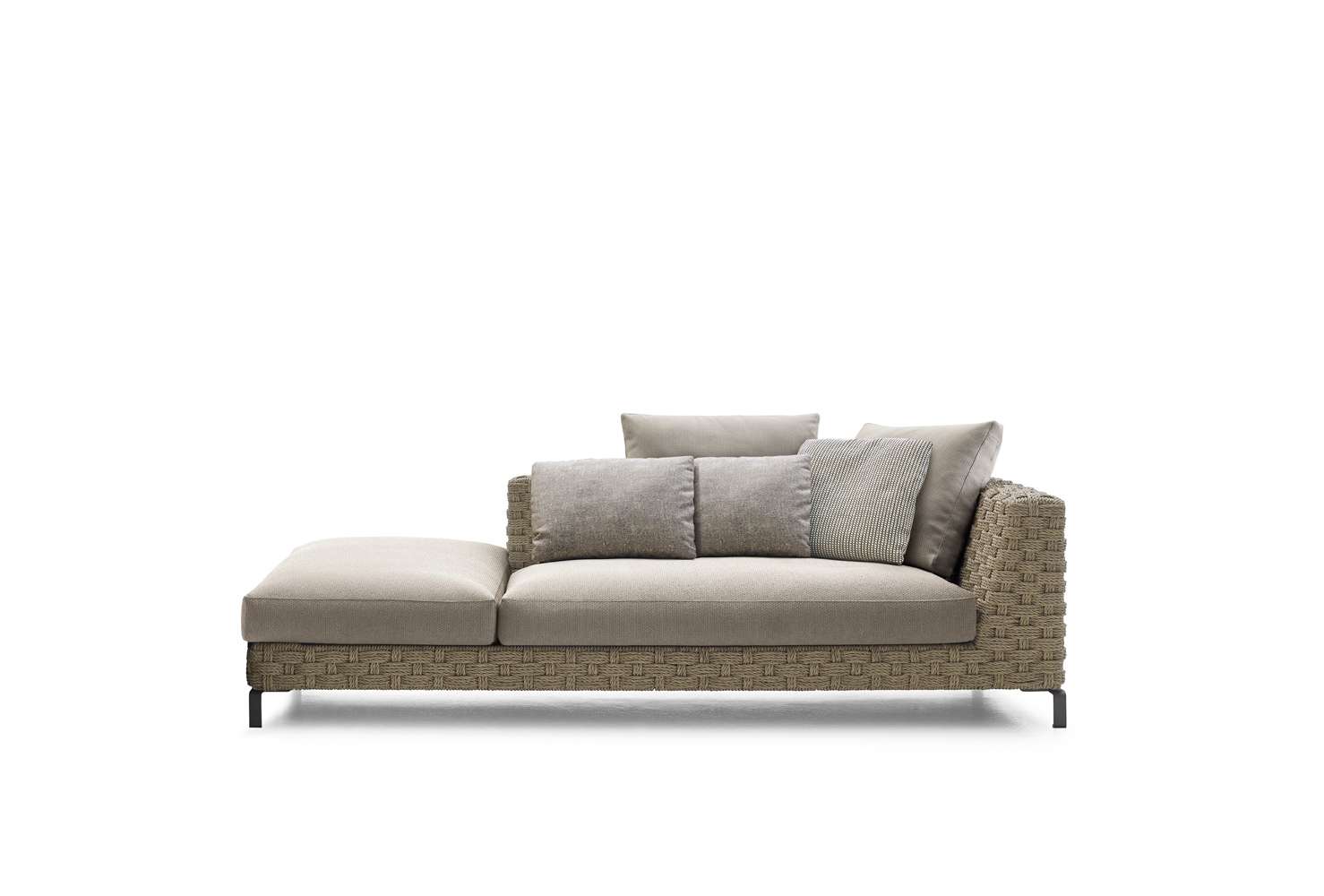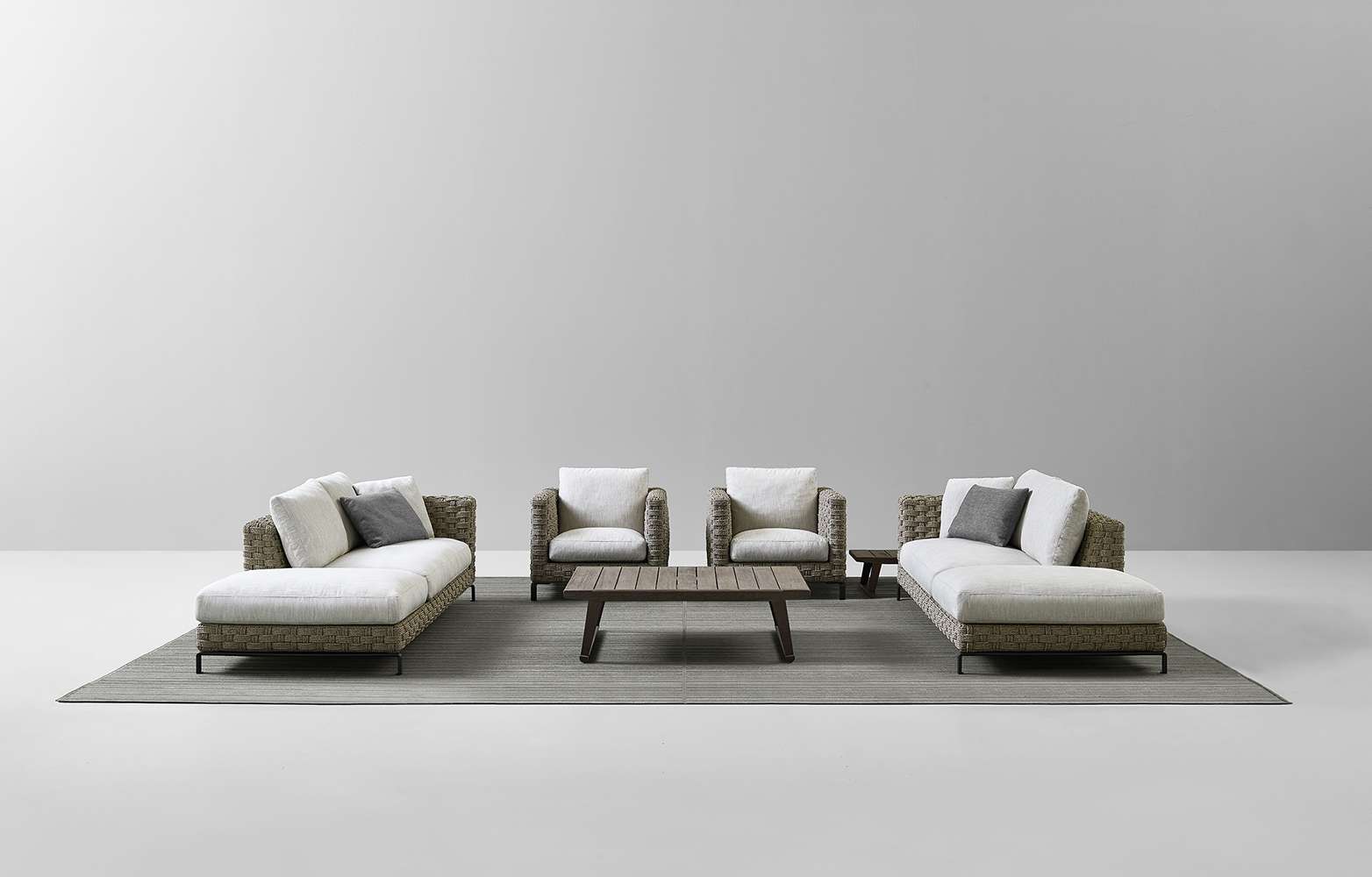 インドアコレクションとしての名声を得た後、アントニオ・チッテリオはRAYシーティングシステムに二つの新しいアウトドアコレクション“ナチュラル"と"ファブリック”を採用しました。両コレクション共に軽量な押し出しアルミニウムフレームを使っていますが、違った素材で編み込みを施している所は異なります。ナチュラルコレクションはマニラ麻を原材料にしたマニラヘンプから発想を得たロープ織りが特徴的であり、アウトドア用の特別な生地を合せることにより完璧に自然と一体化するようにデザインされています。“ナチュラル"と"ファブリック”の両コレクションには二種類の奥行きを持つソファがあり、ラウンジチェアやシェーズロング等のモジュラーエレメントが用意されています。