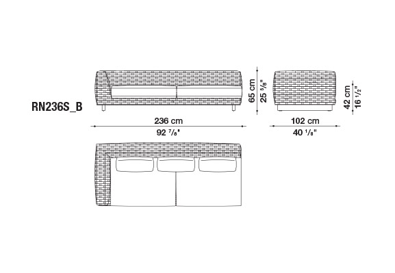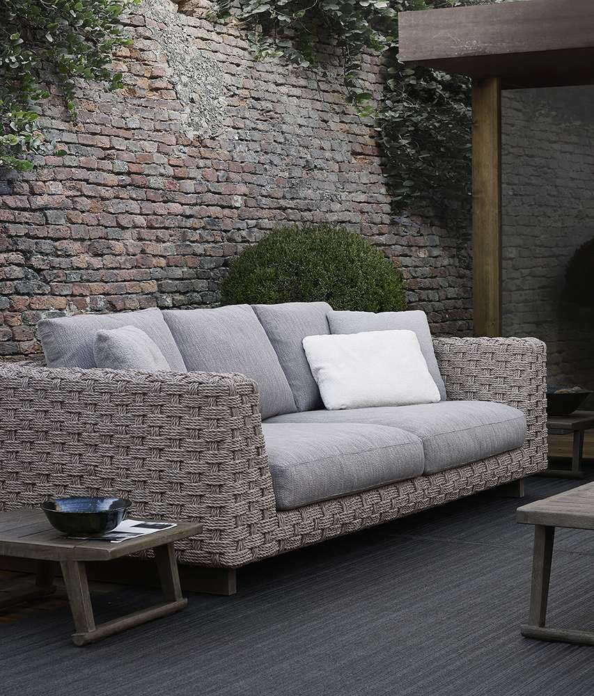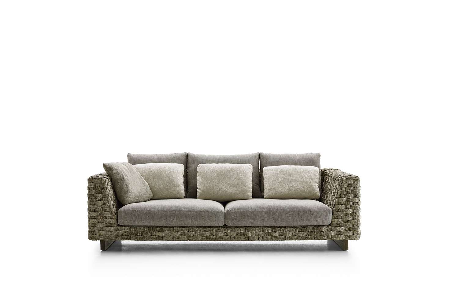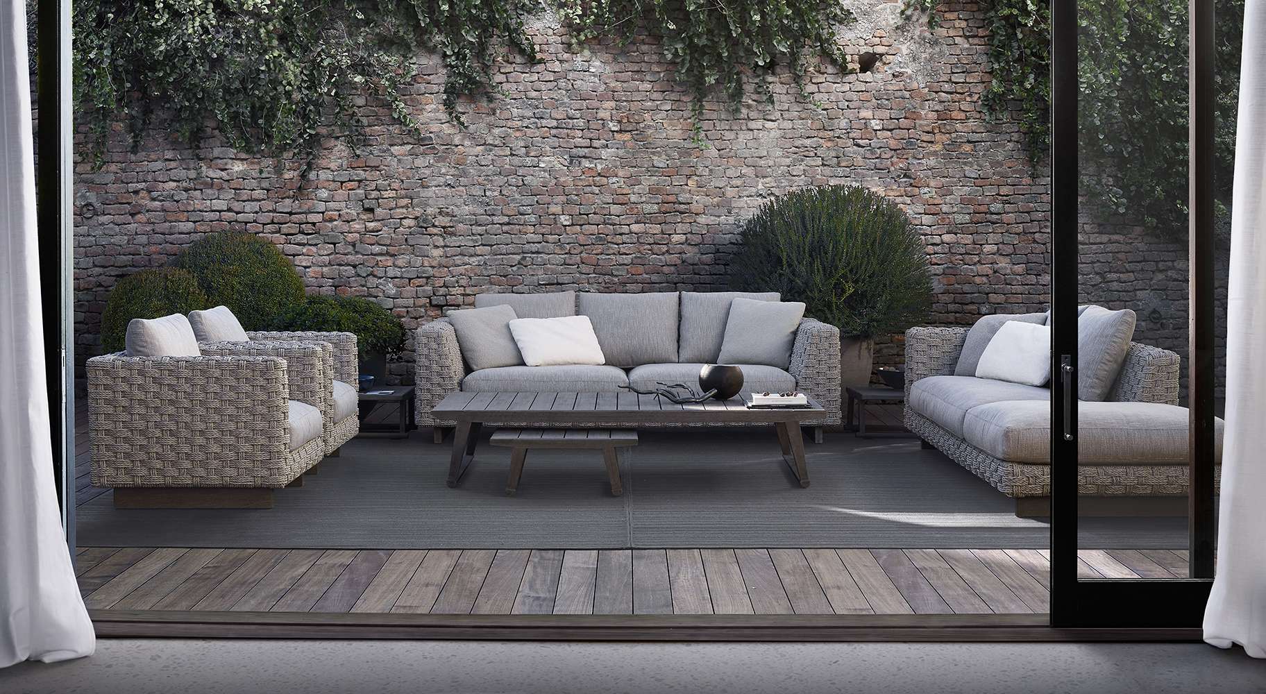 インドアコレクションとしての名声を得た後、アントニオ・チッテリオは、Rayシーティングシステムに、2つの新しいアウトドアコレクション “ナチュラル”と、”ファブリック”という名の新しいバージョンを開発しました。”ナチュラル“は、マニラヘンプを連想させるロープ状のパターンで屋外の自然との調和を図りながら、テキストレンという屋外使用に適した素材を採用しています。 脚部は、新作のチーク無垢材の基壇となります。2つの異なる座面奥行きがあり、ターミナル、シェーズロング、アームチェアなどのエレメントを揃えています。