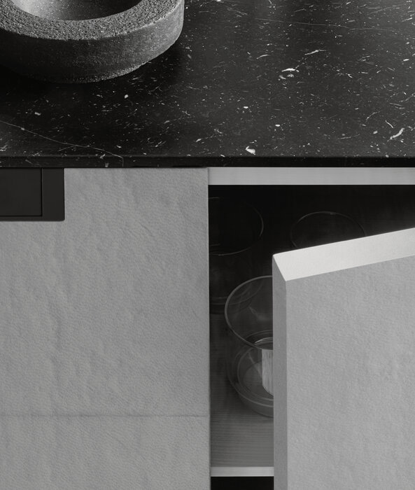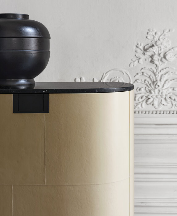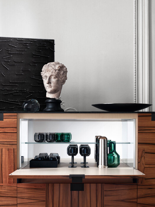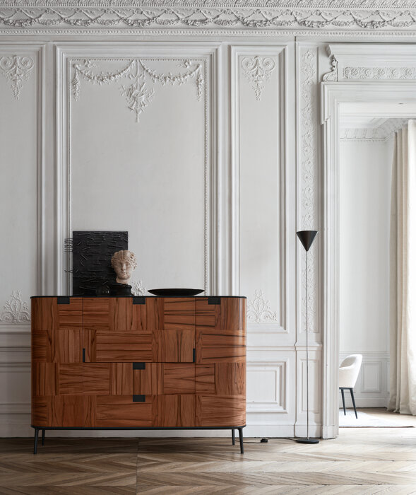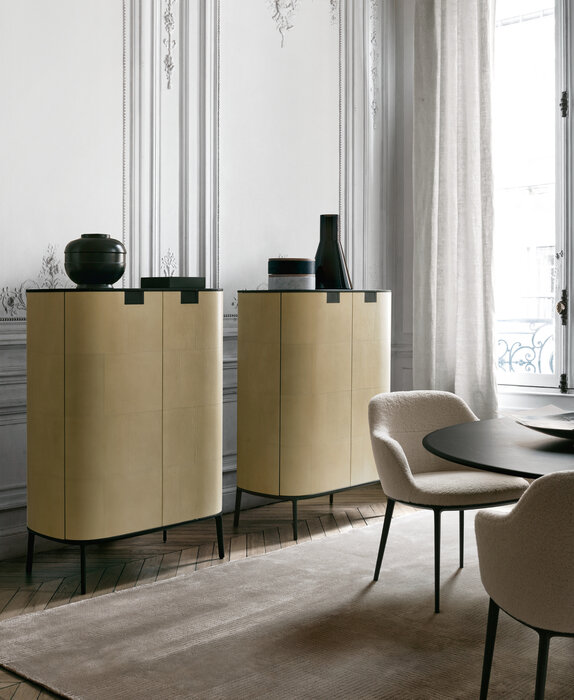 Tesaurus<テザウルス>はAntonio Citterioが手掛けるストレージユニットのコレクション。その上品で優れたアイテムはMaxaltoの歴史に新たなページを加えます。職人の優れた技術が生み出したそのフォルムは、美しい曲線をまとう木製のドアのほか、それを開けるとわずかに突起した棚がついています。側面は収納量に応じて選択できます。Tesaurusの高さと幅は3タイプ。2ドアと4ドアタイプがあり、引き出しとフラップドアがついています。ベースはCaratos<カラトス>のチェアデザインに採用したアルミダイキャスト。トップ部分にはブラックマルキーナ、ホワイトカラーラ、エンペラドールなどのマーブルを施しました。内側は精製したフリゼメープルを採用。ゴージャスなパーチメントや木の仕上げに職人の技術とこだわりが溢れています。オークやチリ産ティネオは化粧仕上げされ、板目による千鳥格子柄が見事です。パーチメントのカバーリングは長い時間をかけて丁寧に作られ、自然素材の特徴を熟知した専門の職人により張られることにより、その表面は時間の経過と共にワインさながらに熟成し、上品な色合いへとその表情を変えていきます。このような細やかな手仕事を一目見れば、Tesaurusの品質の高さお分かりいただけるでしょう。コレクションの各アイテムは類似品の出にくい一点ものであり、本物だけが持つオリジナリティに溢れています。