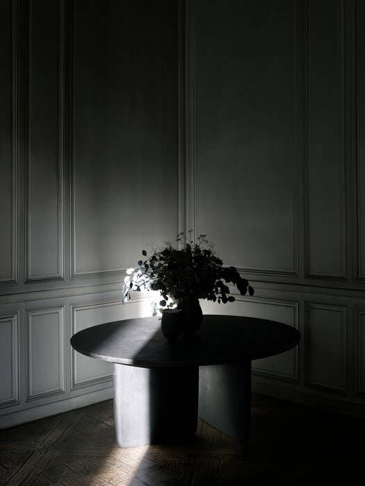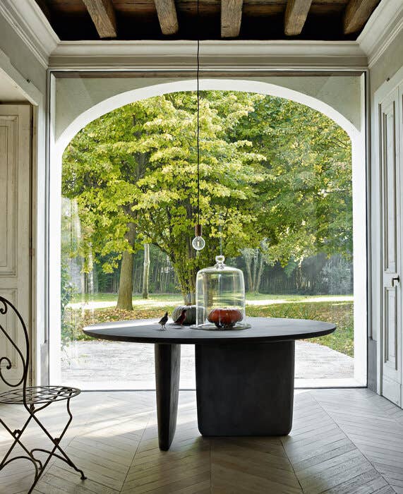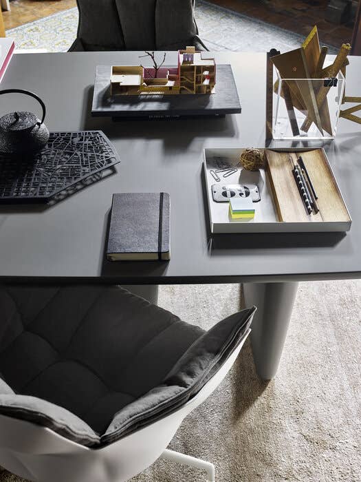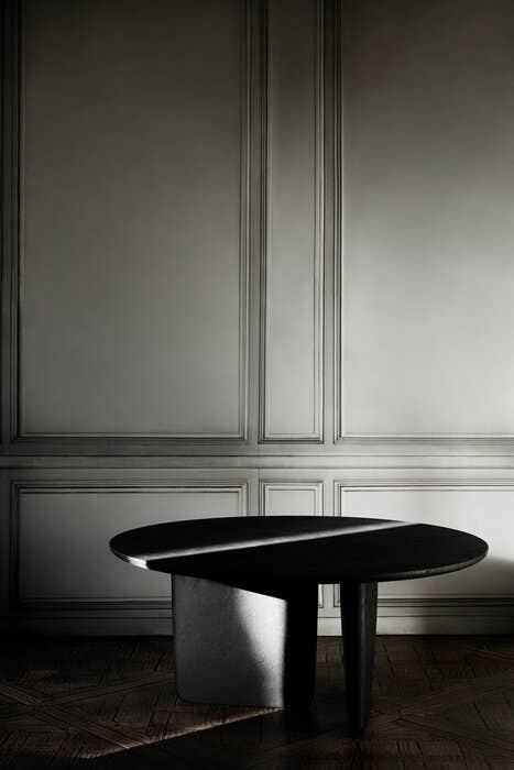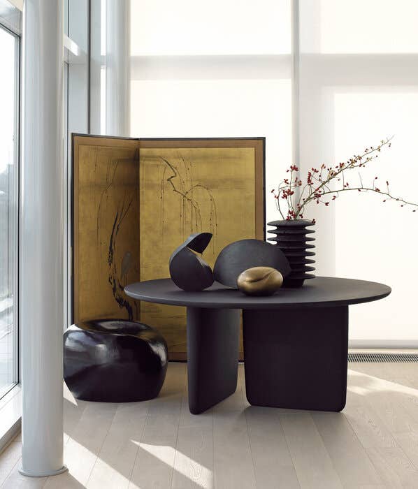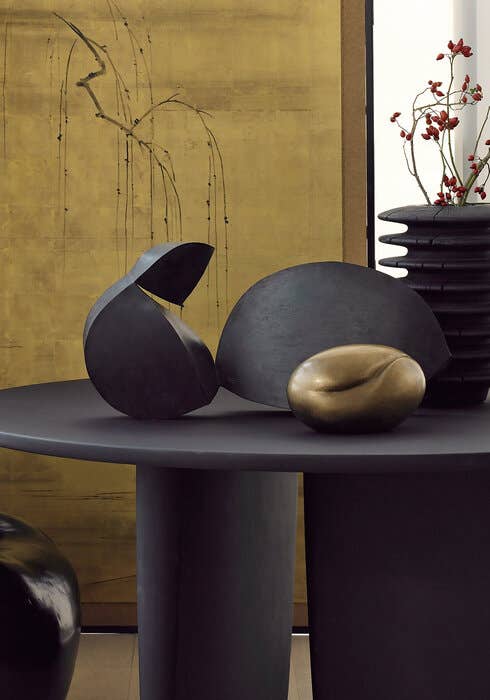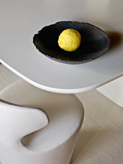 Tobi-Ishi<トビイシ>テーブルは、日本庭園に使われている飛び石をイメージして名付けられました。機能性と彫像のような外観の両方を兼ね備えた素晴らしい作品です。天板と台座の関係性は見る角度によってさまざまな表情を見せ、仕上げもセメント、大理石、レッドキャンディとブルースモークの洗練された色調のラッカーなど、個性的なテーブルに仕上がっています。当初は丸い形状でしたが、現在は天板の両端が細くなった長方形の大型バージョンが登場し、仕上げも丸型と新しい長方形の両方に16種類のサテンラッカー仕上げが施されています。