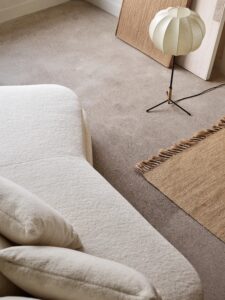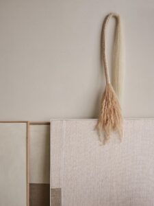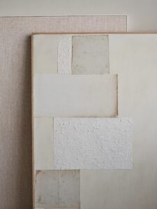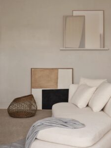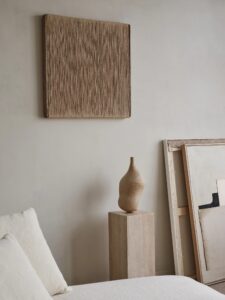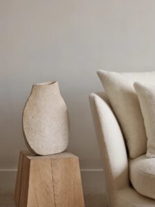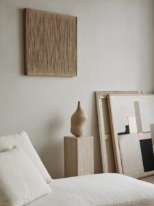 静かなロンドンのスタジオでは、〈アポロ〉のシェーズロングが、ポール・フィルプやカリーナ・スマグロフによるビスケットトーンの滑らかな陶器作品、ローレンス・カルヴァーとリザ・ジャイルズによる素材感あふれるアートピースとともに並び、オーク材やトラヴァーチンの台座の力強い造形と対話するように配置されています。