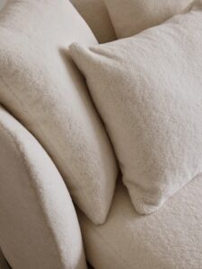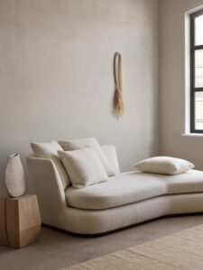 「内側へと弧を描くカンマ型のシェーズロングは、くつろぐ人の身体のラインに寄り添うようにデザインされている。」