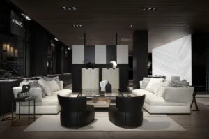 やわらかな色調で統一された空間には、ブラックとホワイト――チッテリオが「ブランドのDNA」と語る――がアクセントとして配され、流れるように連続する、温もりに満ちた展示構成が生まれています。