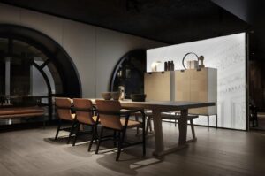 Lithos シリーズは、収納とディスプレイの機能を兼ね備えたキャビネットやローテーブルを展開。空間の中心に据えても映える構築的なデザインが印象的です。